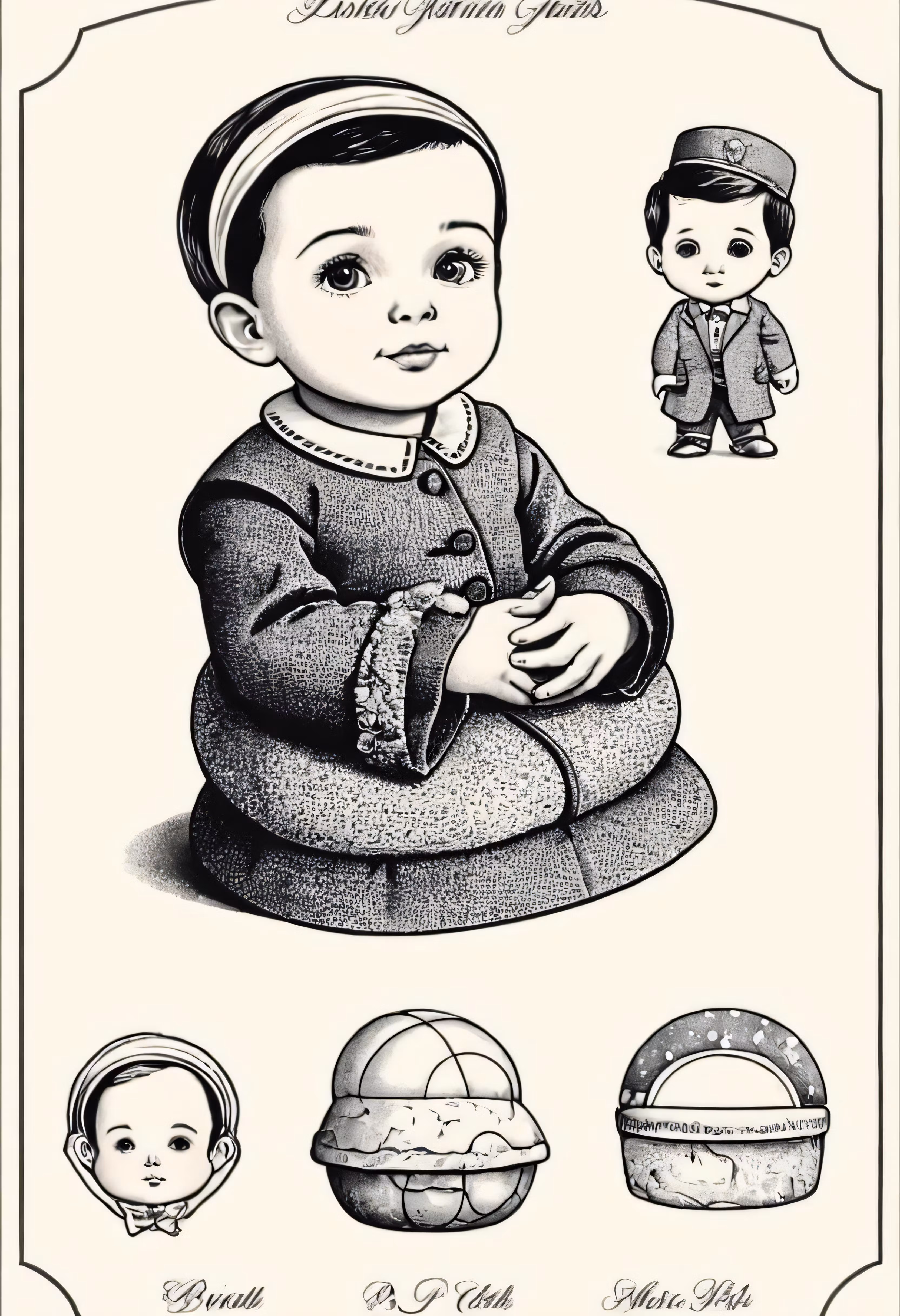 High resolution picture, free to use, an old fashioned drawing of a baby with hat and clothing