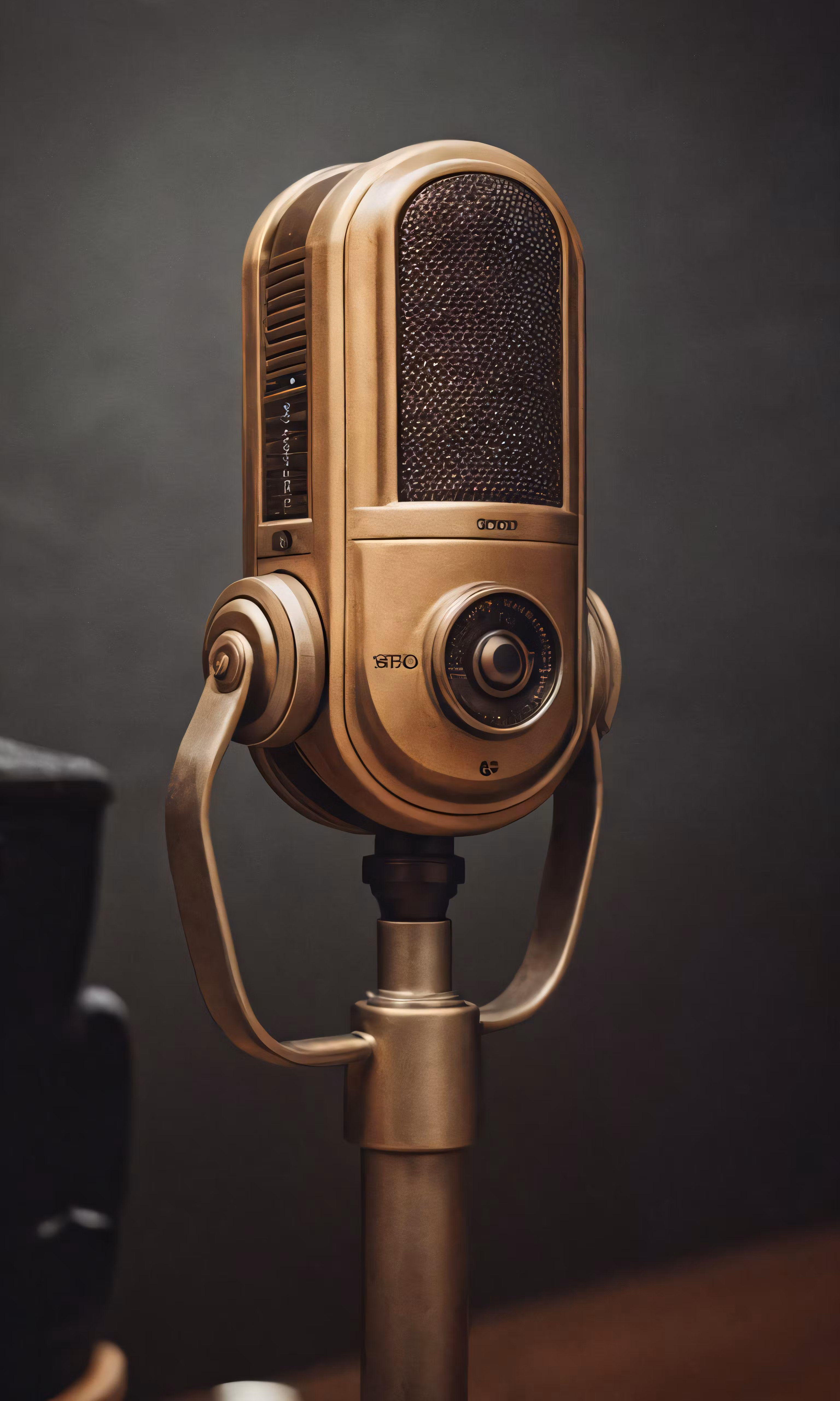 High resolution picture, free to use, an old gold microphone sitting on top of a desk