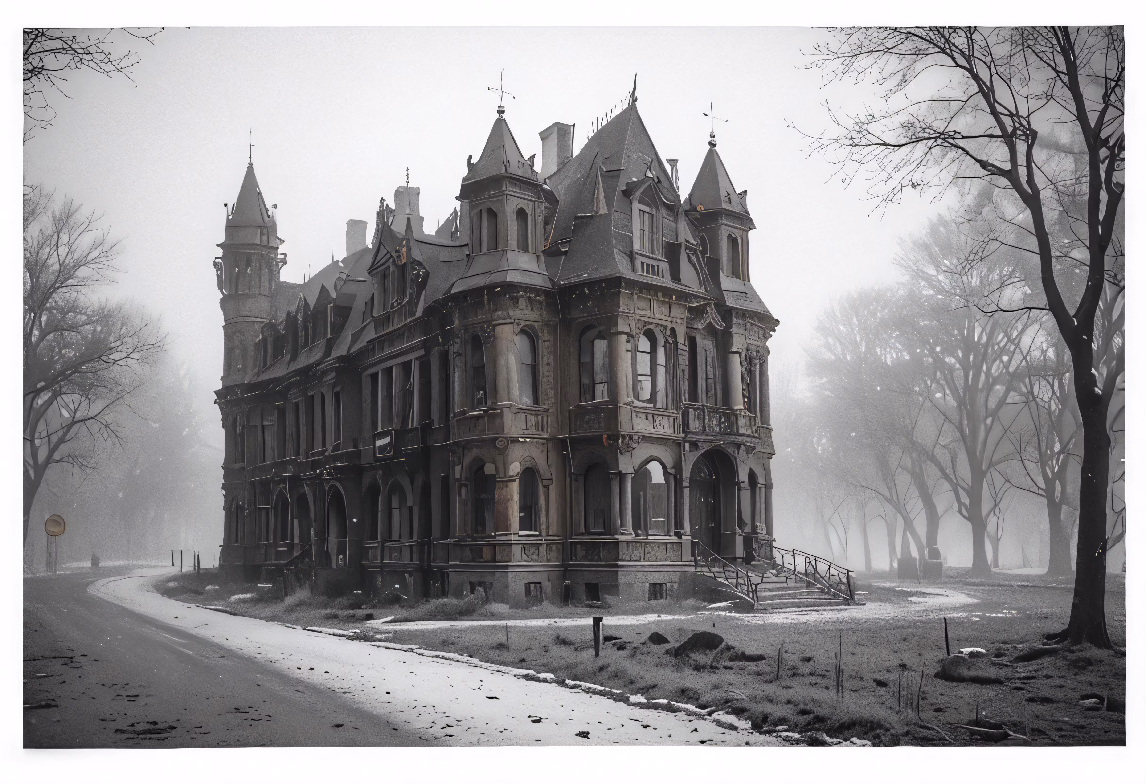 High resolution picture, free to use, an old gothic   styled house stands on the edge of a misty cemetery