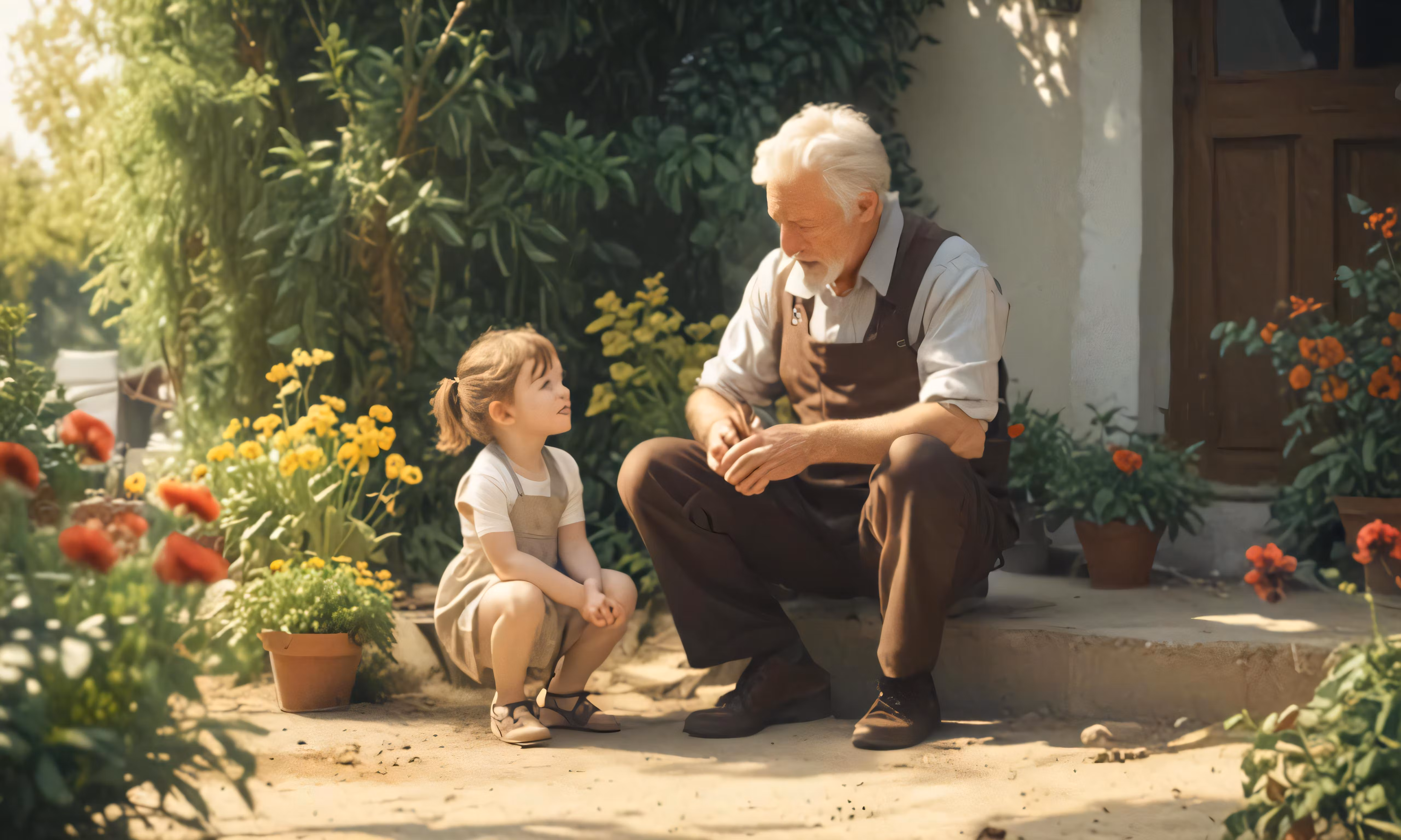 High resolution picture, free to use, an old man is crouching while the young girl sits by flowers