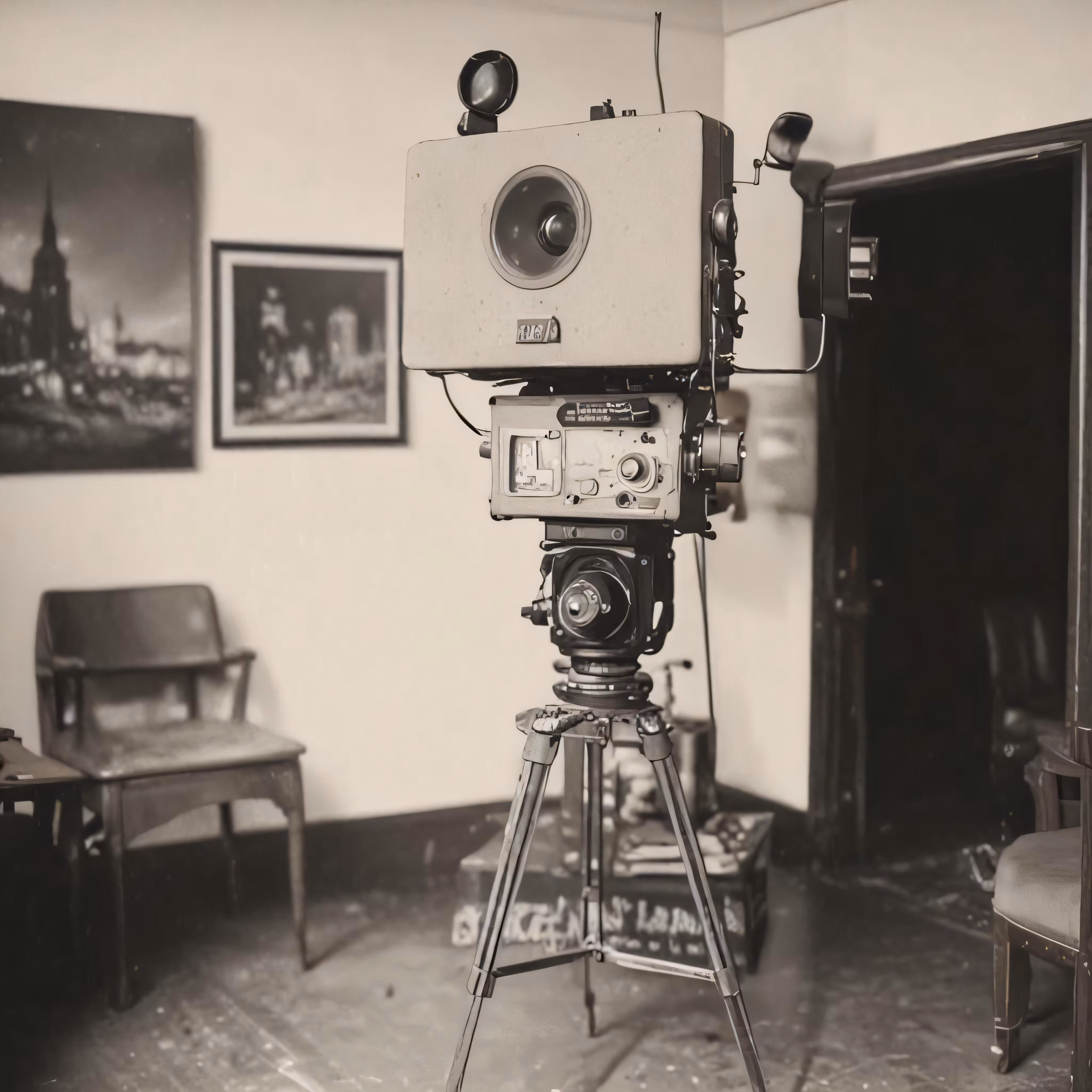 High resolution picture, free to use, an old photo of a tripod camera sitting in a living room