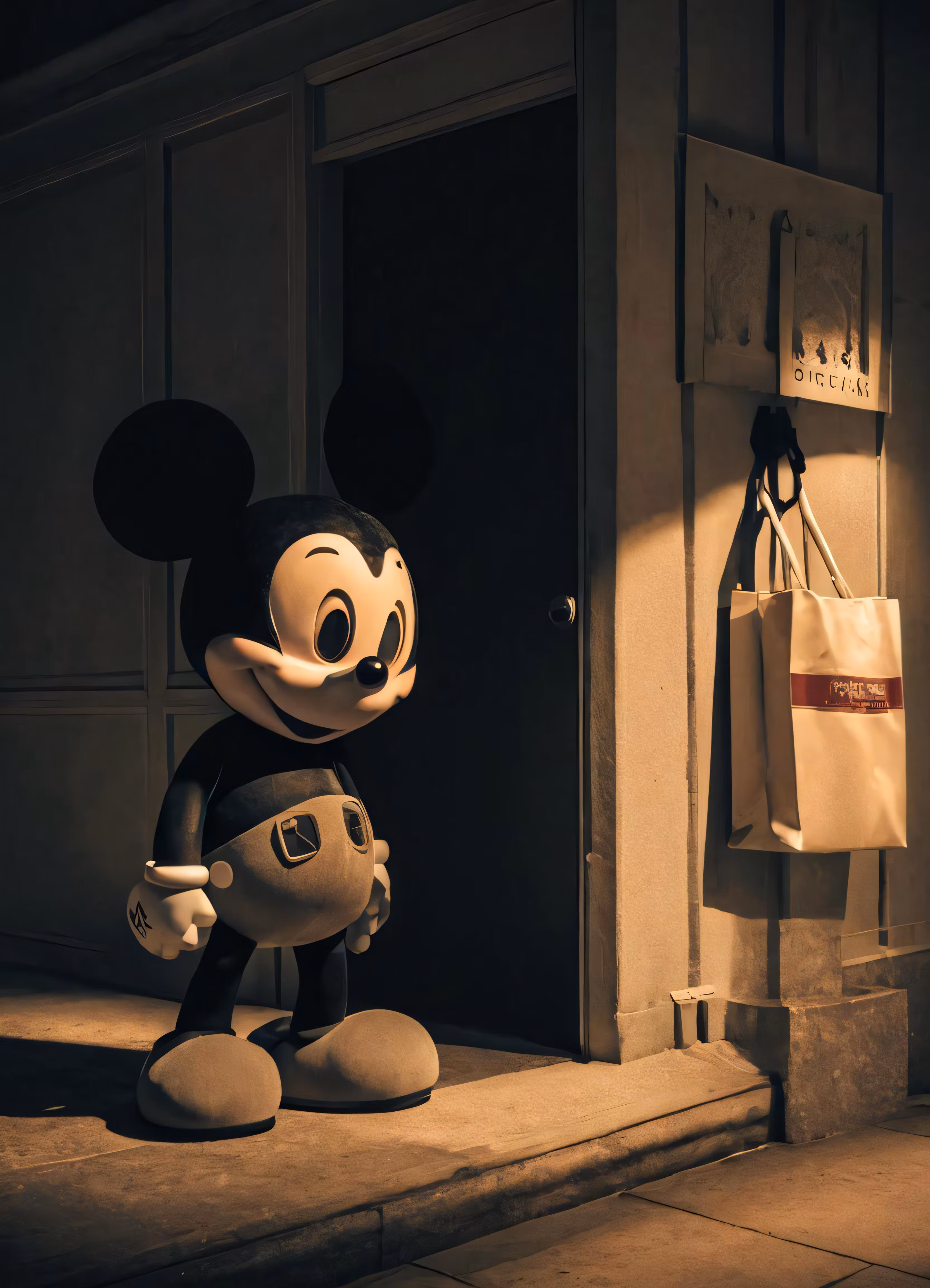 High resolution picture, free to use, an old photo of mickey mouse in front of a building