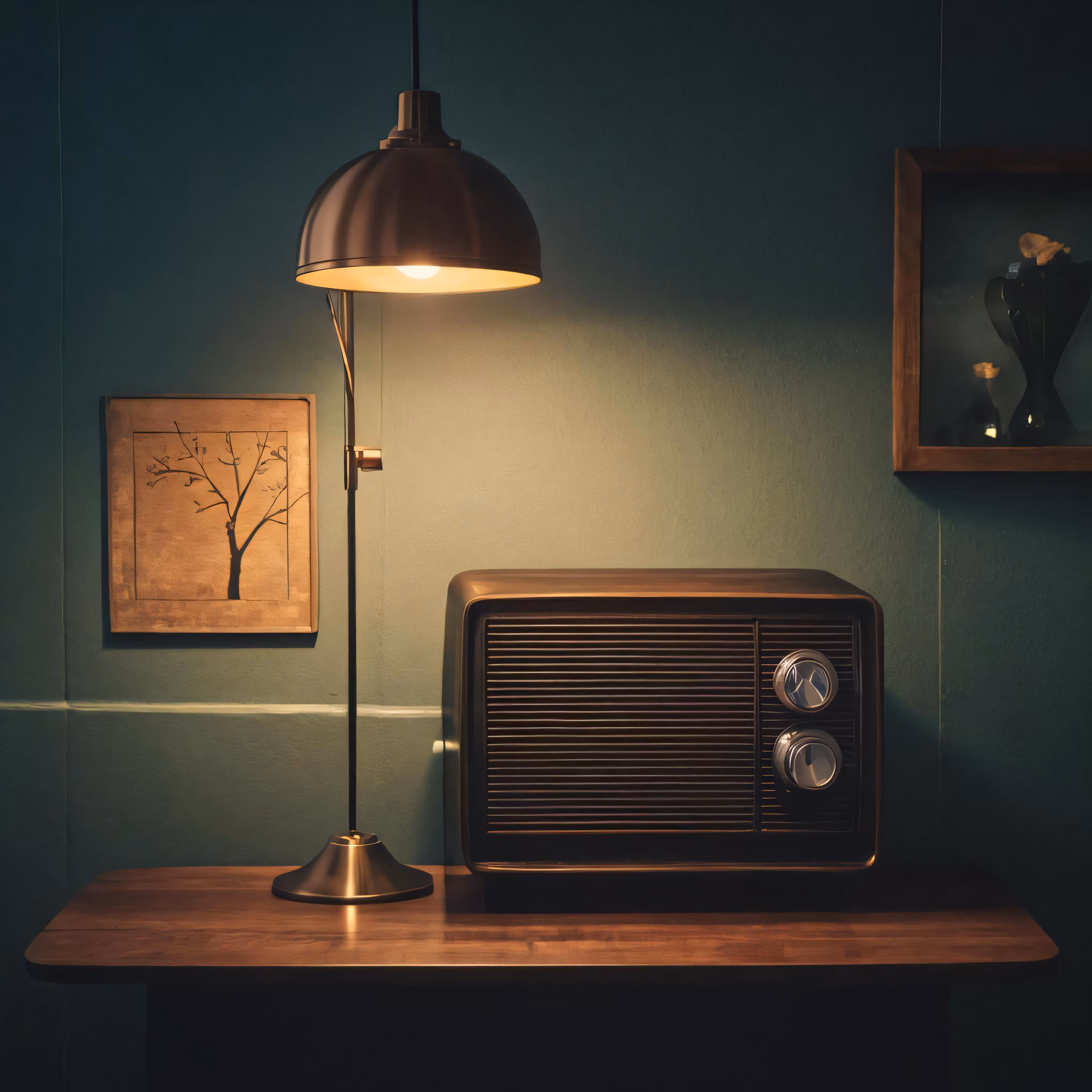 High resolution picture, free to use, an old radio sits on a wooden desk with a lamp