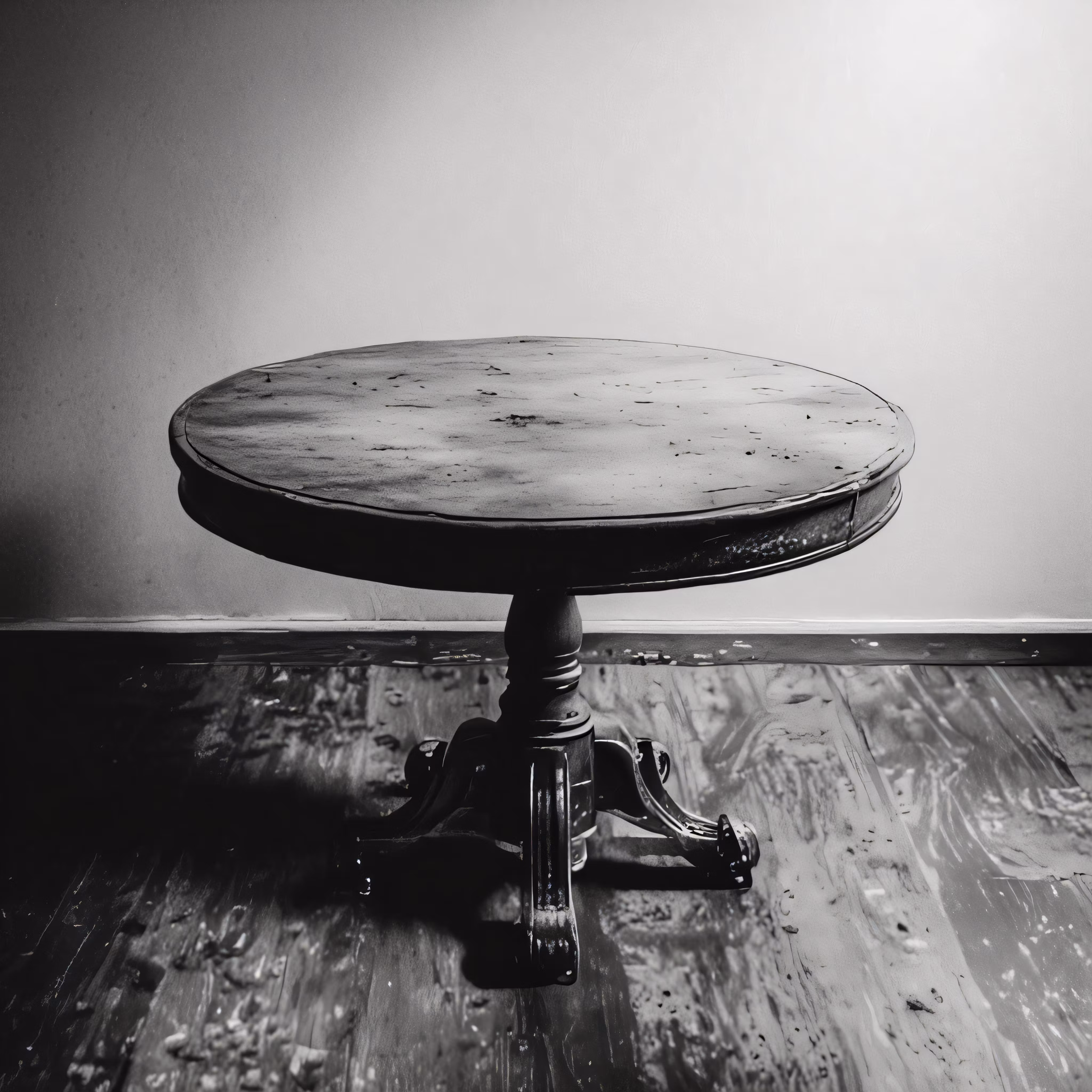 High resolution picture, free to use, an old round wooden table sits on a wooden floor