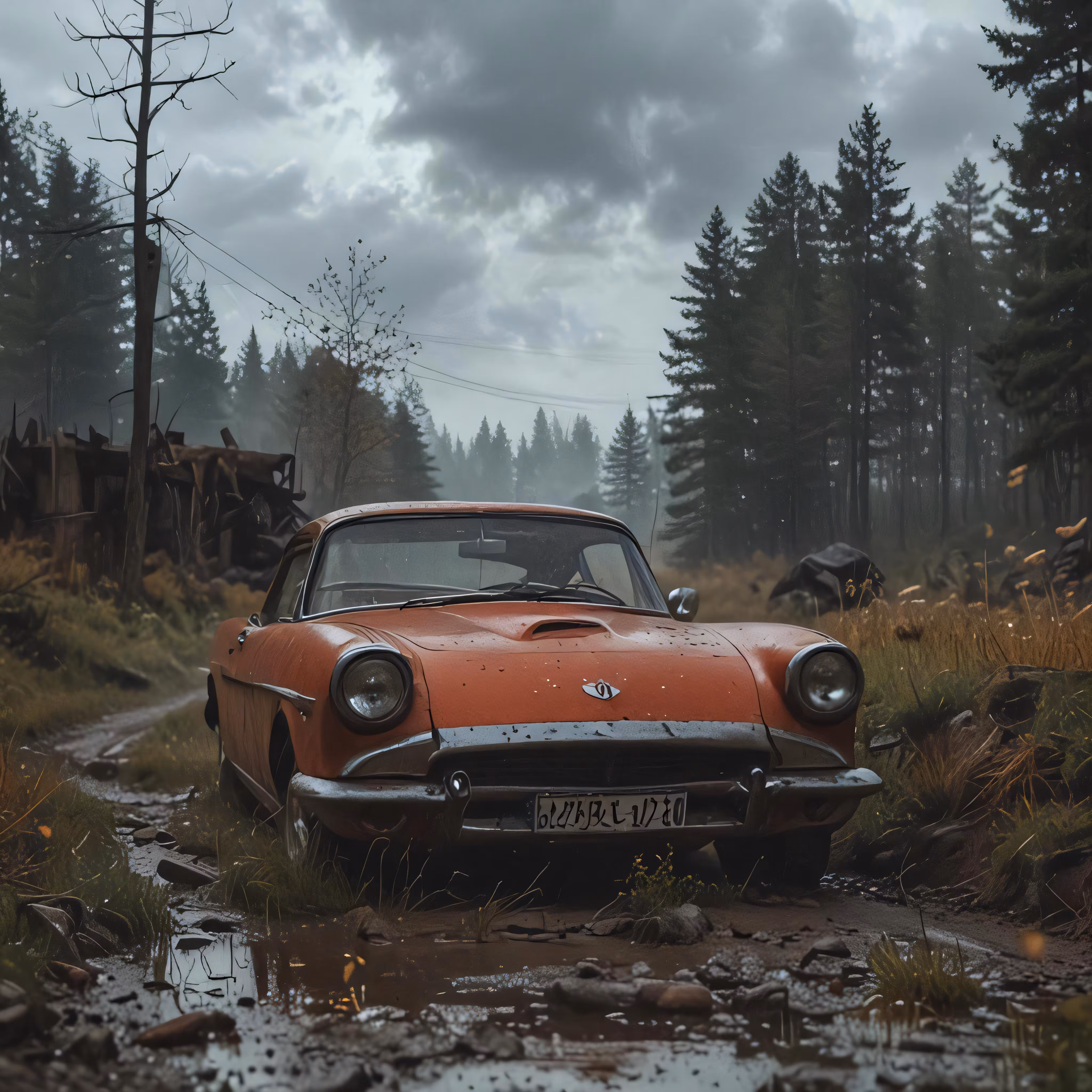High resolution picture, free to use, an old rusted car sitting on a dirty road in the middle of a forest