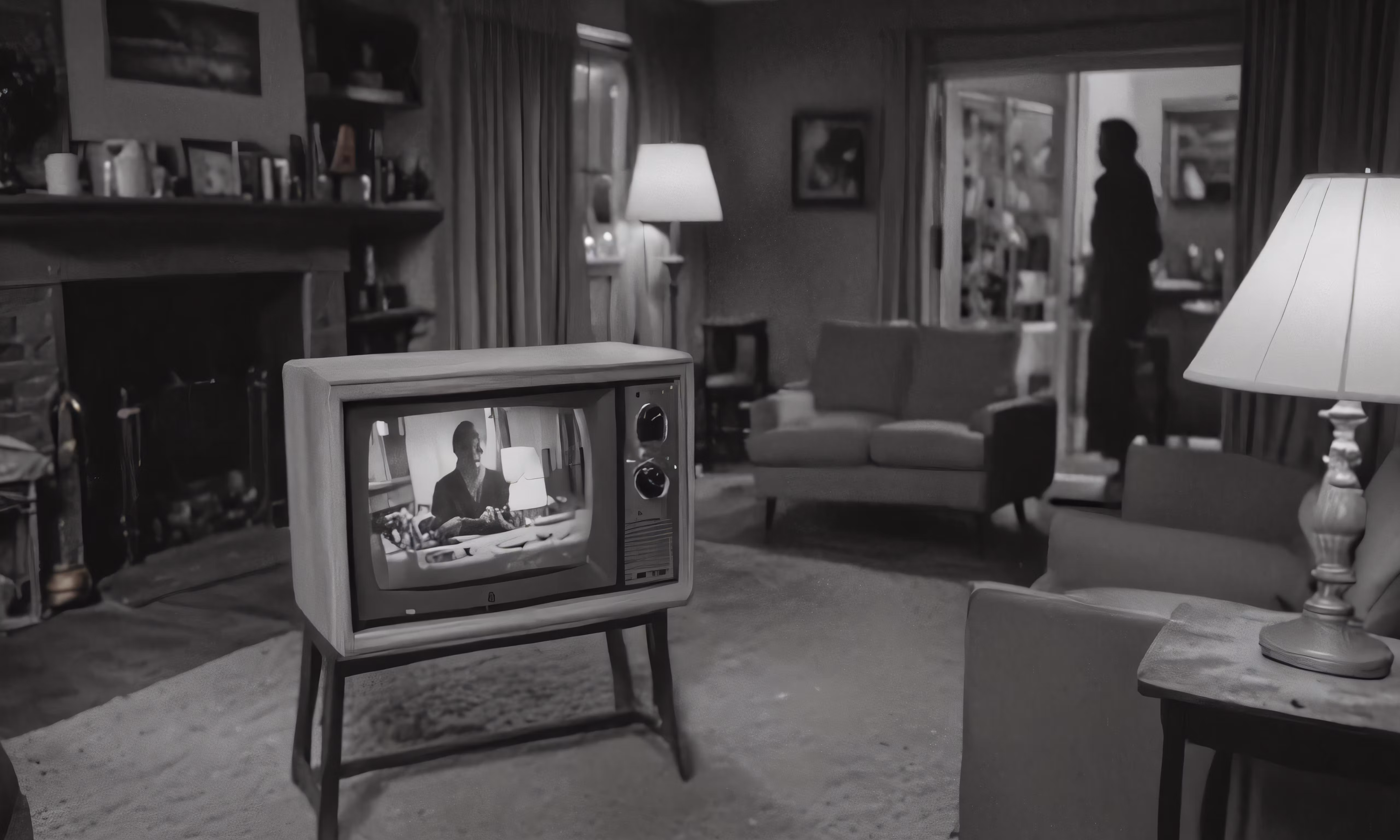 High resolution picture, free to use, an old television in a living room with the woman standing near it