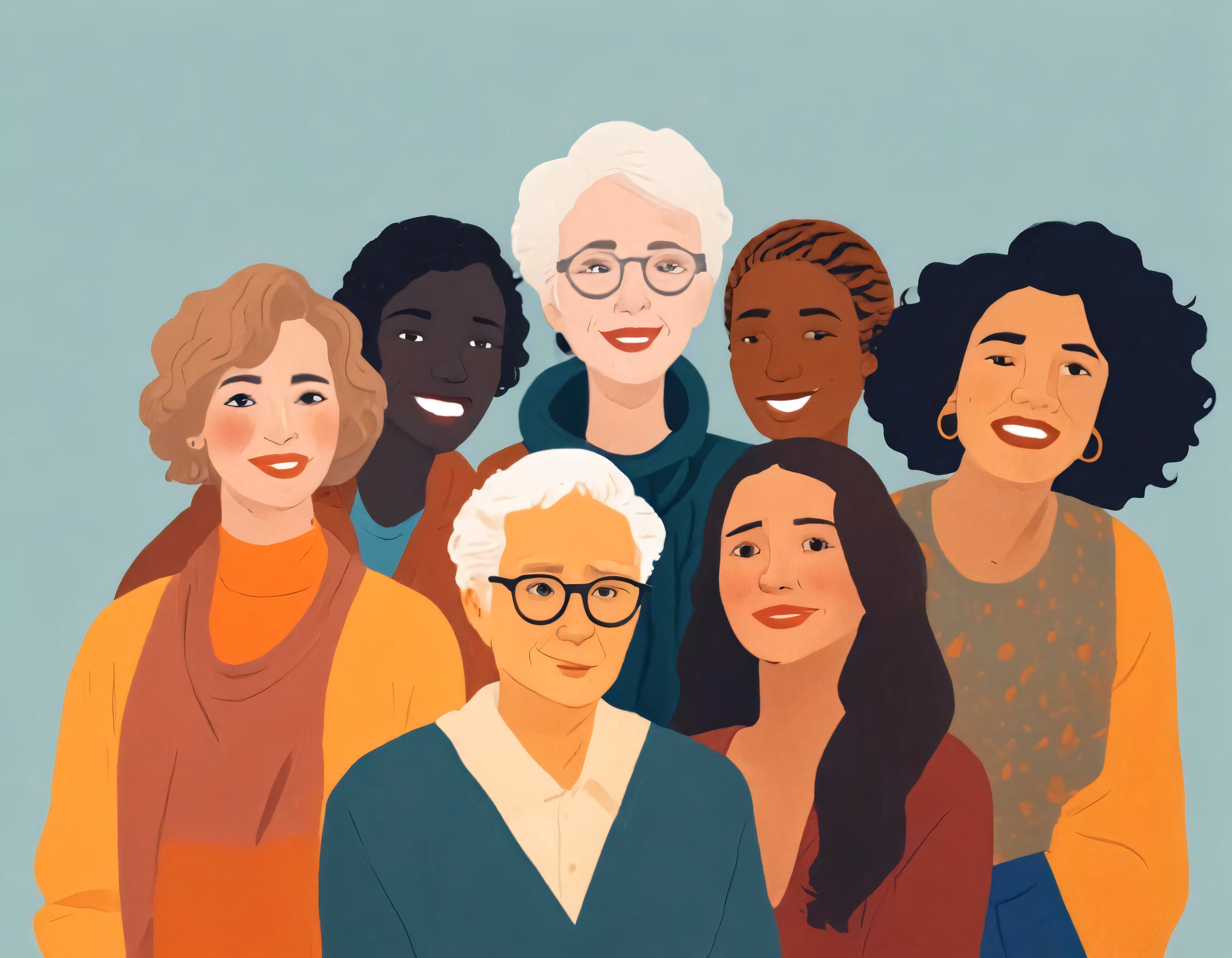 High resolution picture, free to use, an old woman in a blue shirt with her eight ladies