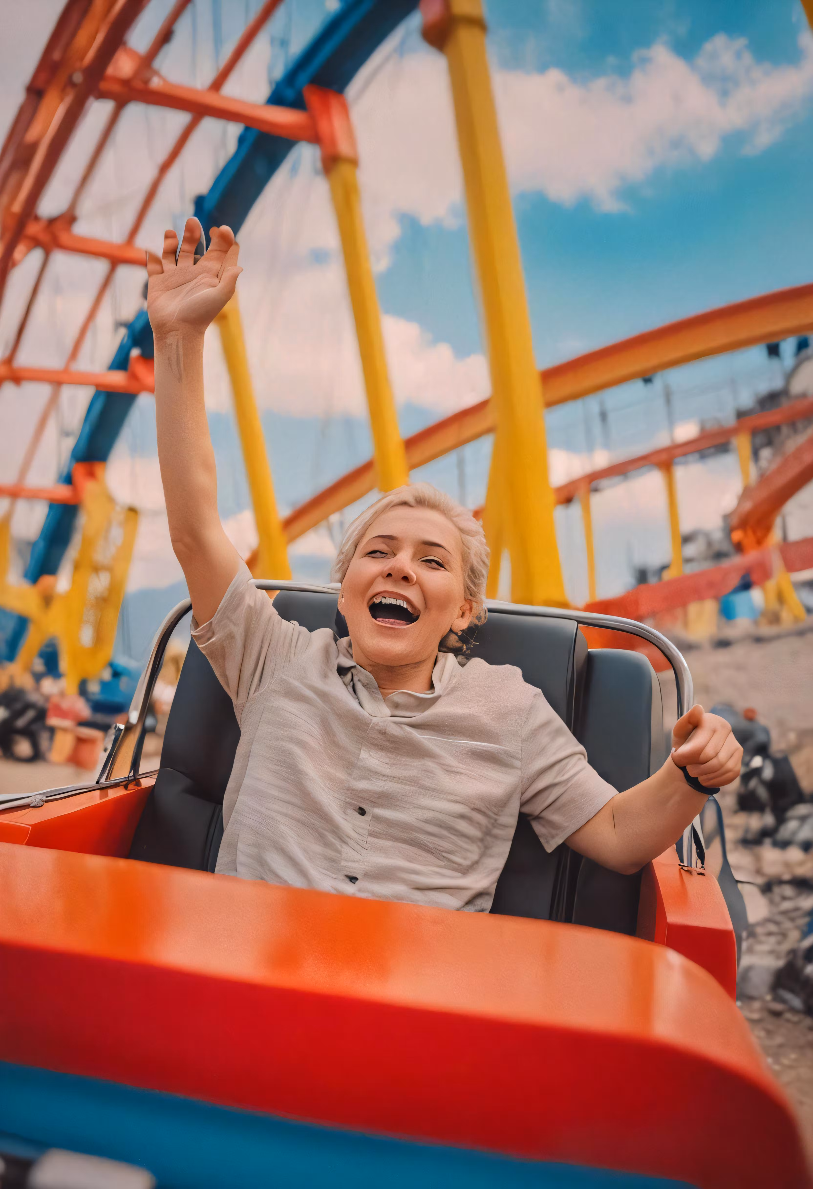 High resolution picture, free to use, an old woman is in the roller coaster with her arms up