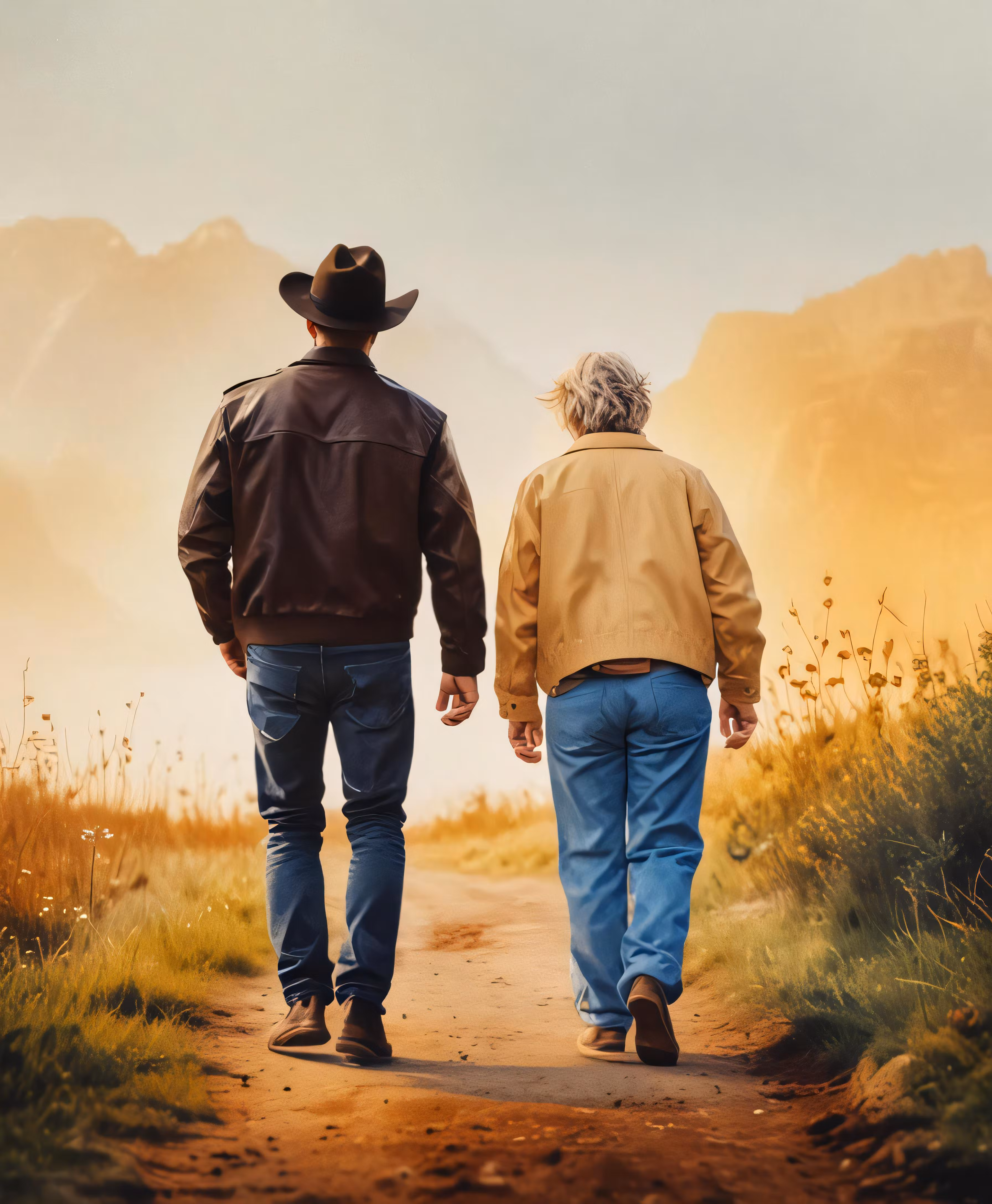 High resolution picture, free to use, an older man and woman holding hands walking down a dirt road