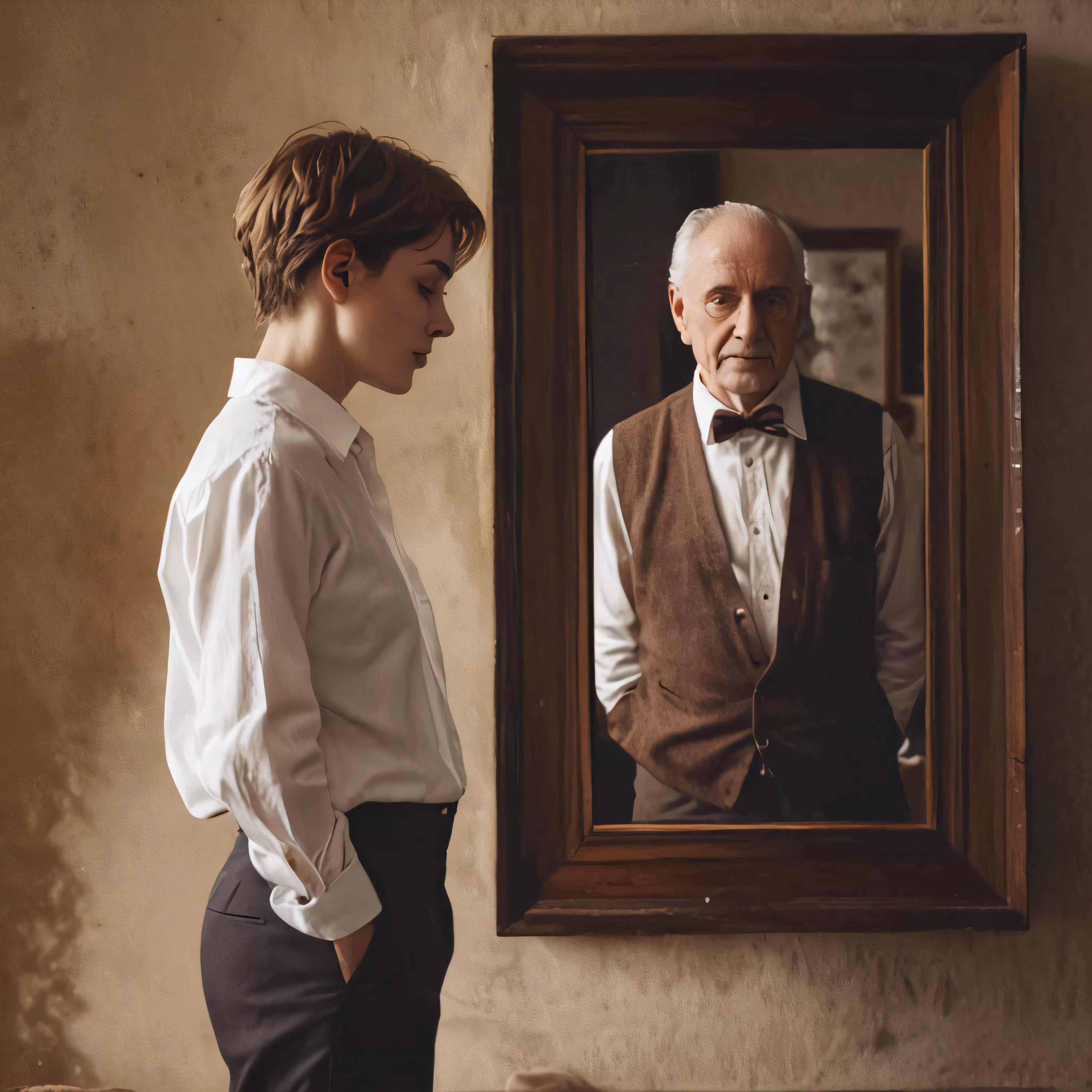 High resolution picture, free to use, an older man in a vest and bow tie in front of a mirror