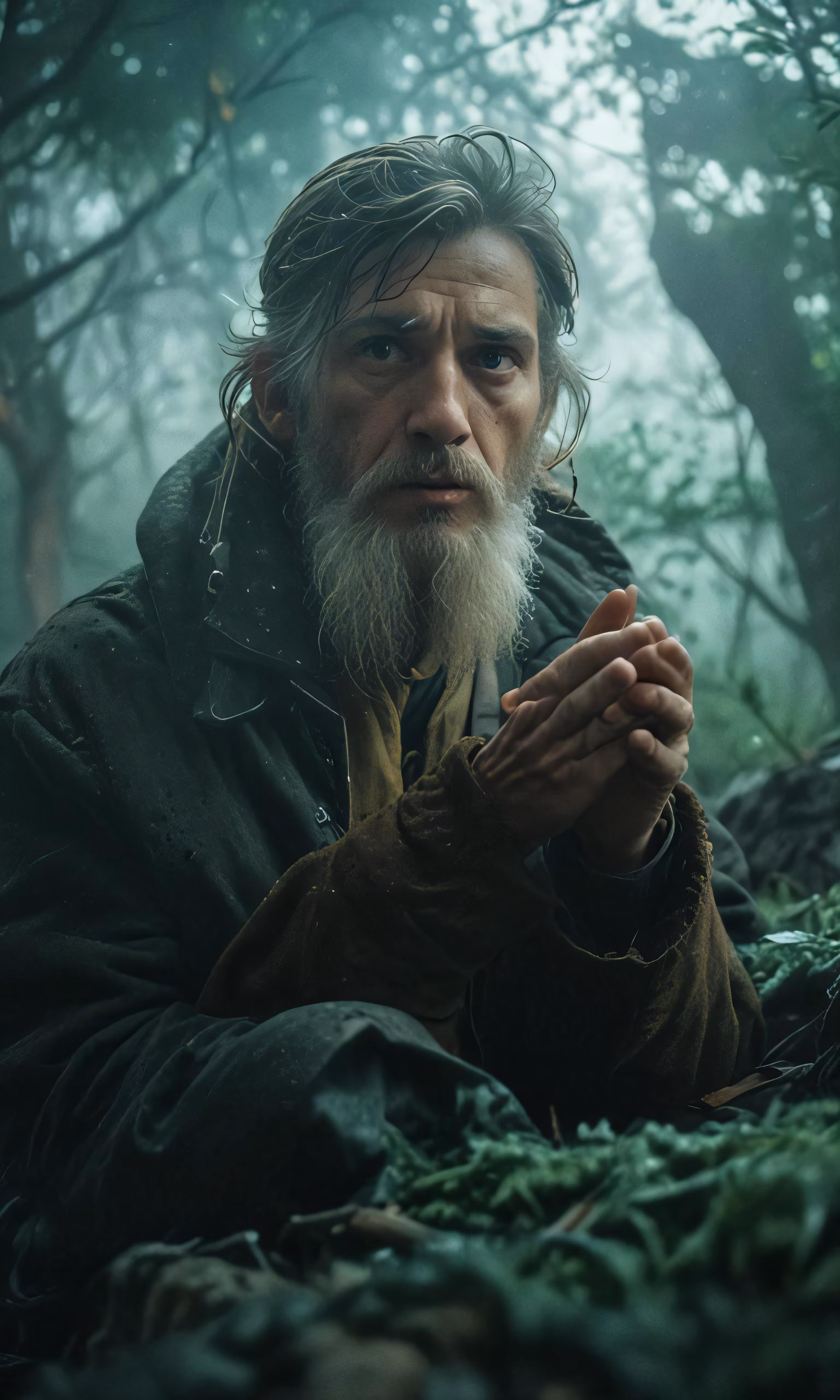 High resolution picture, free to use, an older man sitting in the middle of a forest