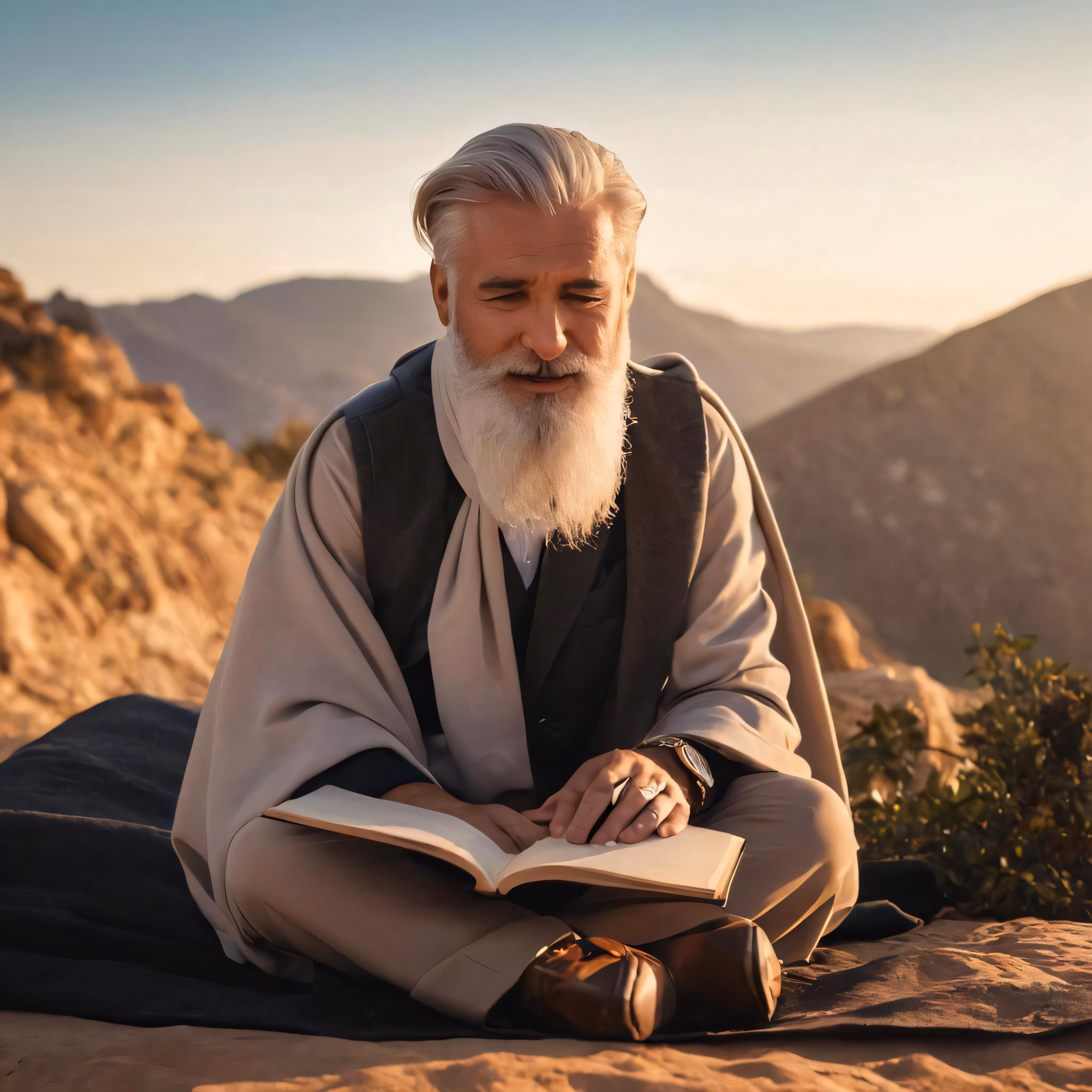 High resolution picture, free to use, an older man sitting on the ground holding a book