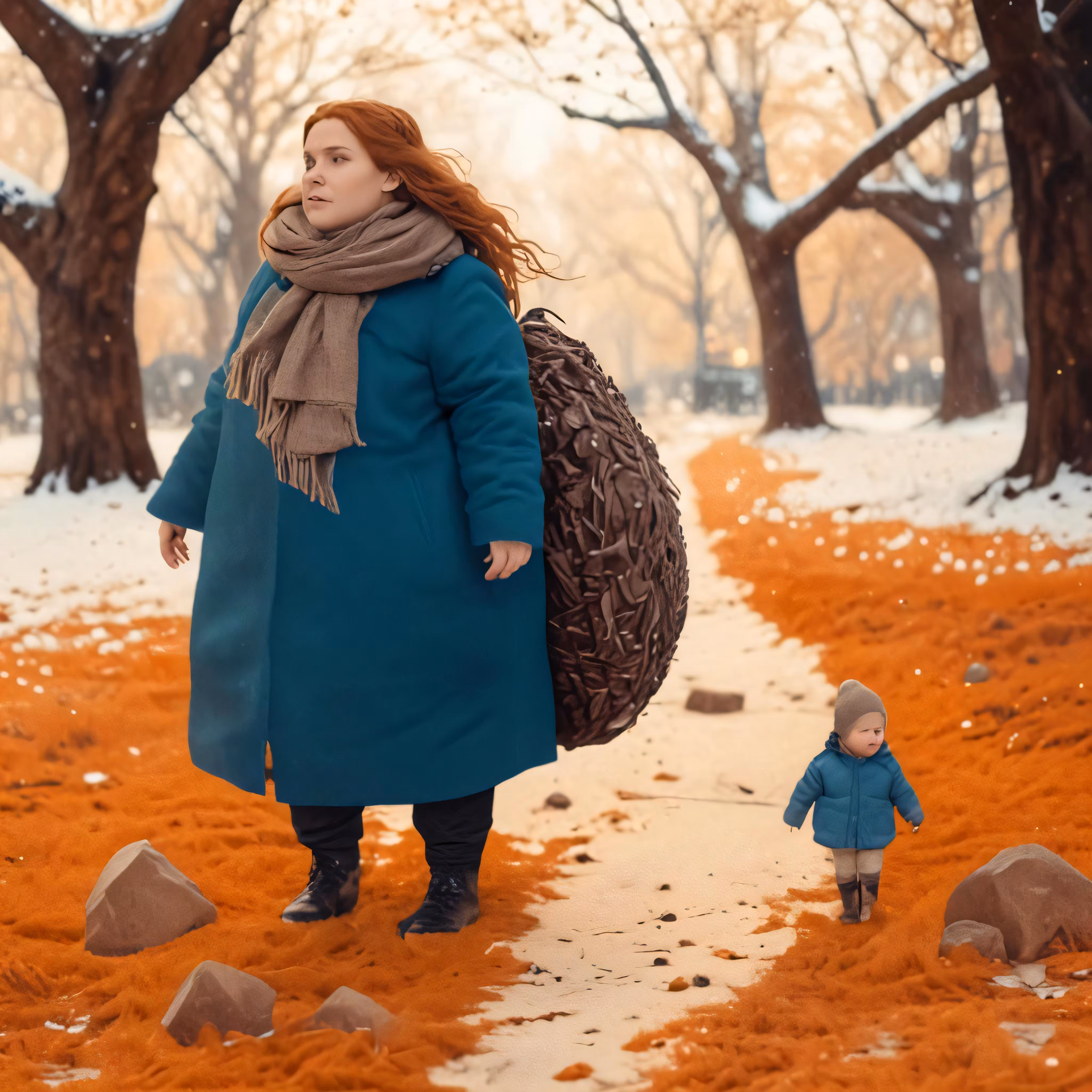 High resolution picture, free to use, an older woman walking down a path with a child holding a brown bag