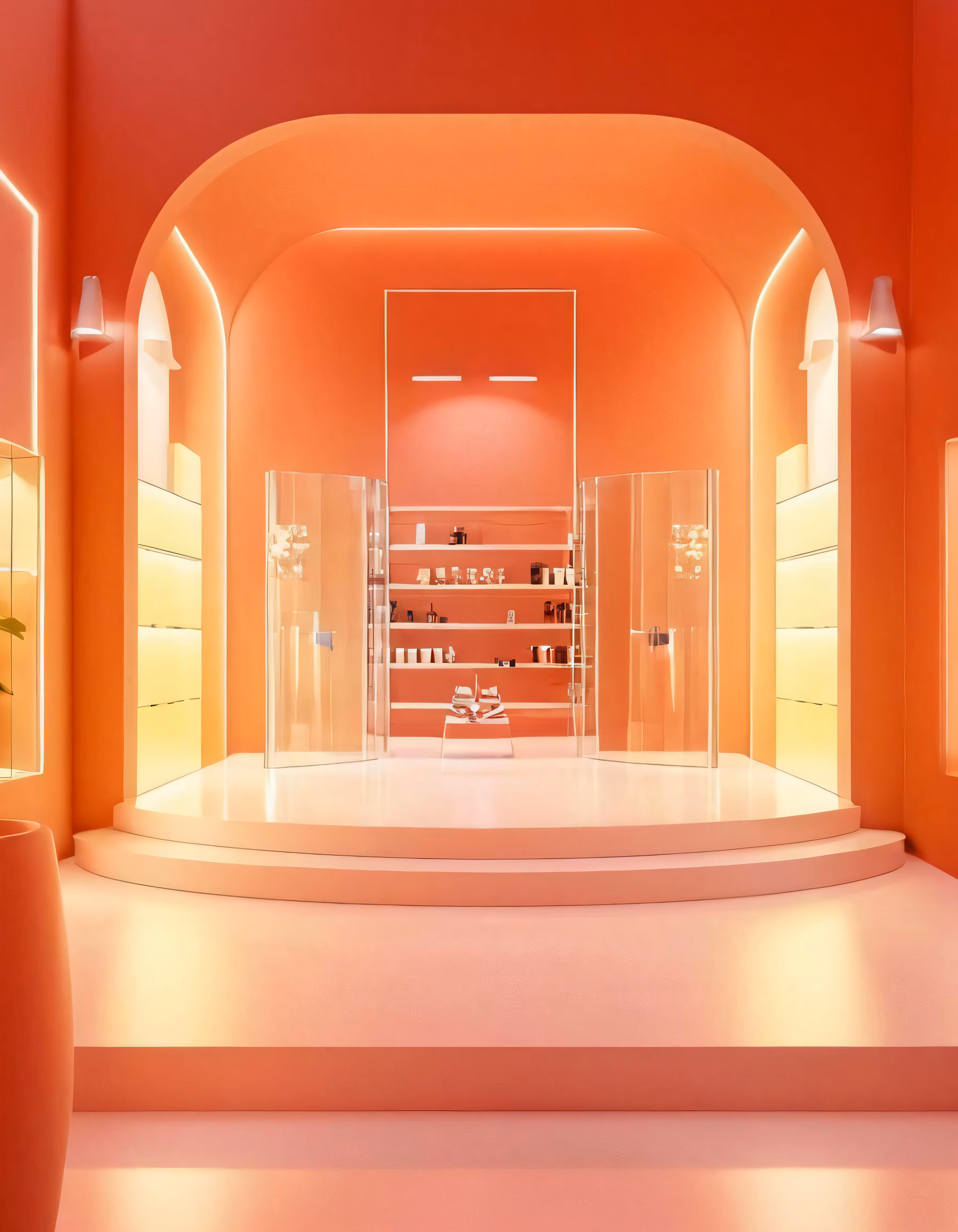 High resolution picture, free to use, an open white room with orange lighting and steps