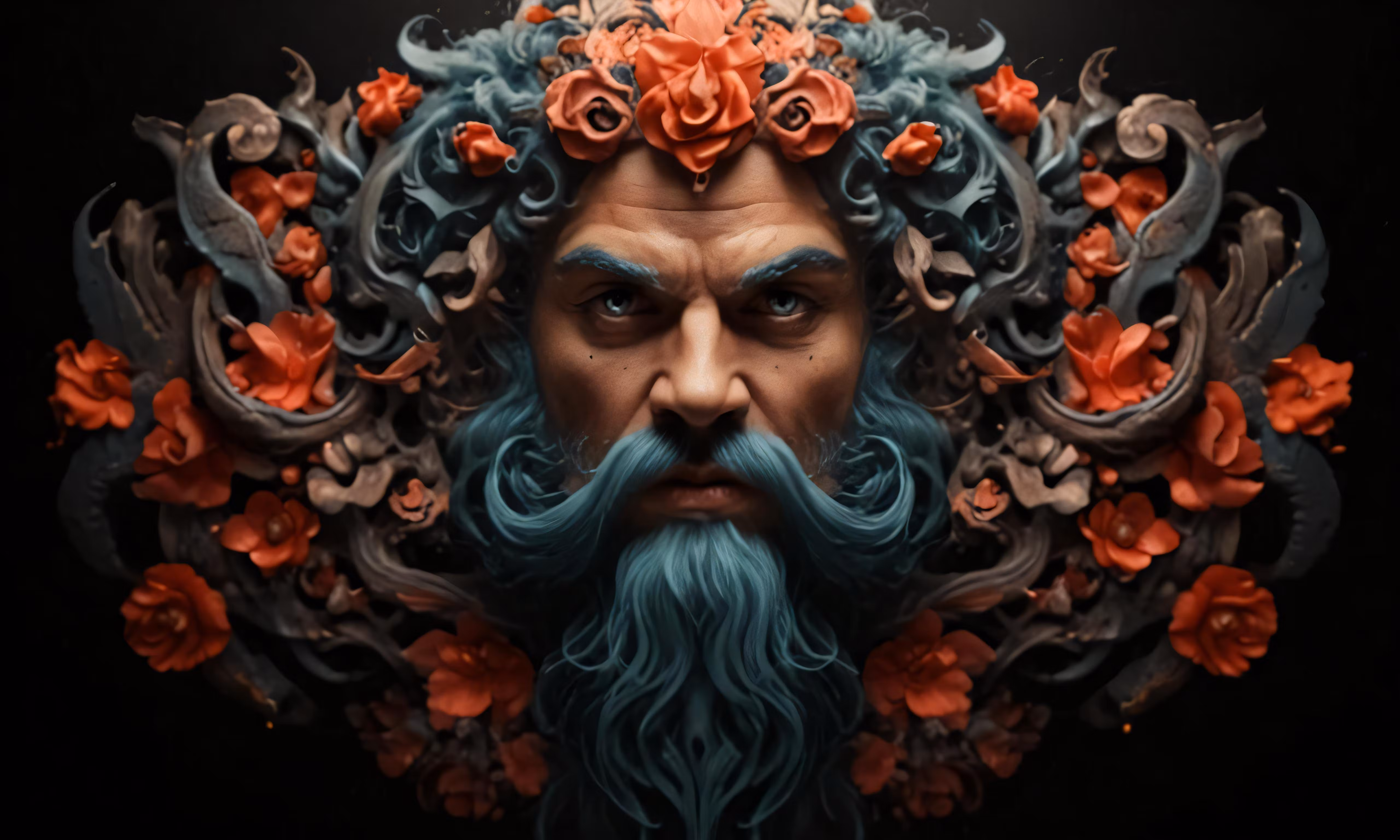 High resolution picture, free to use, an orange, blue and red beard and some flowers