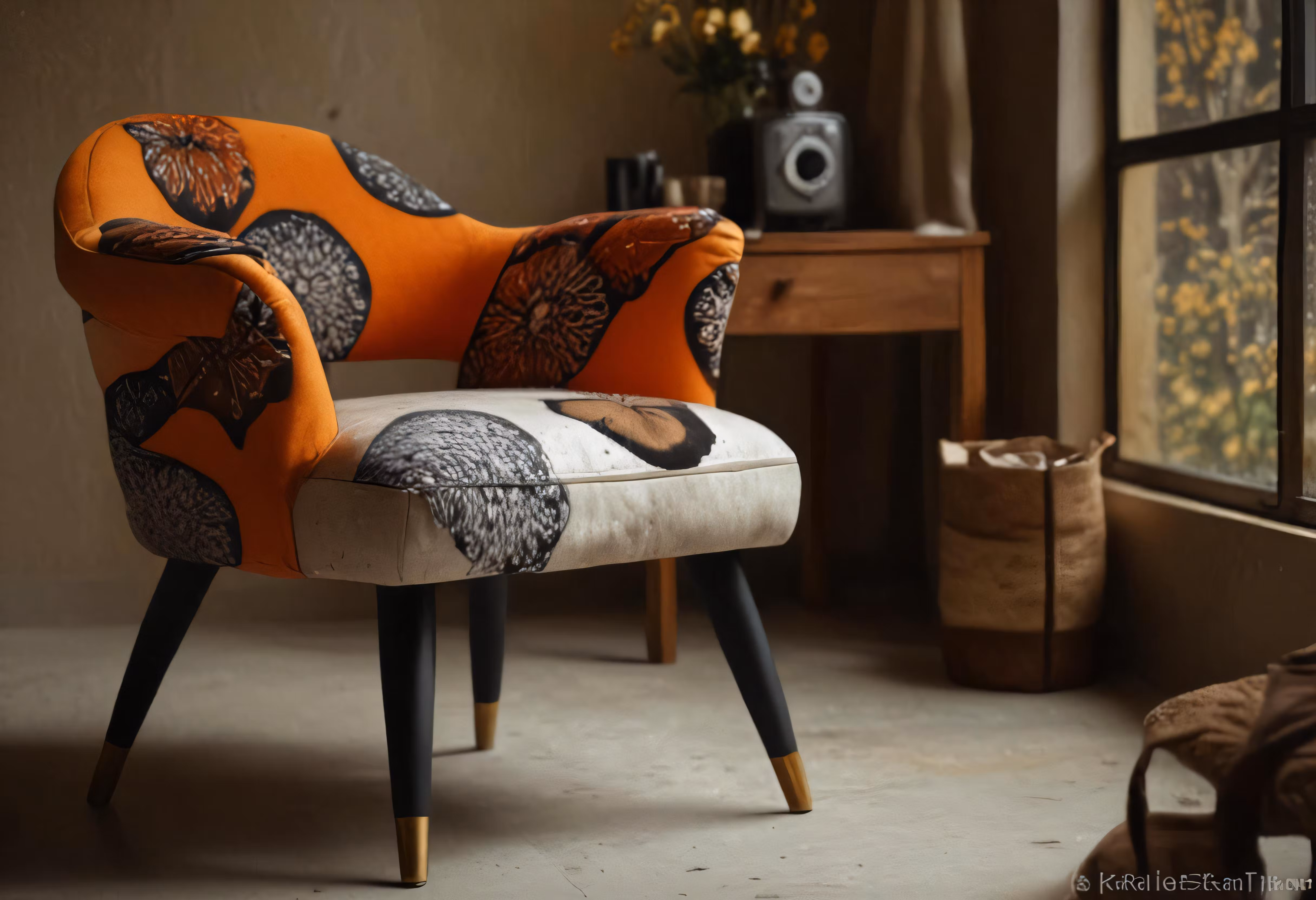 High resolution picture, free to use, an orange and black chair with a painting on it