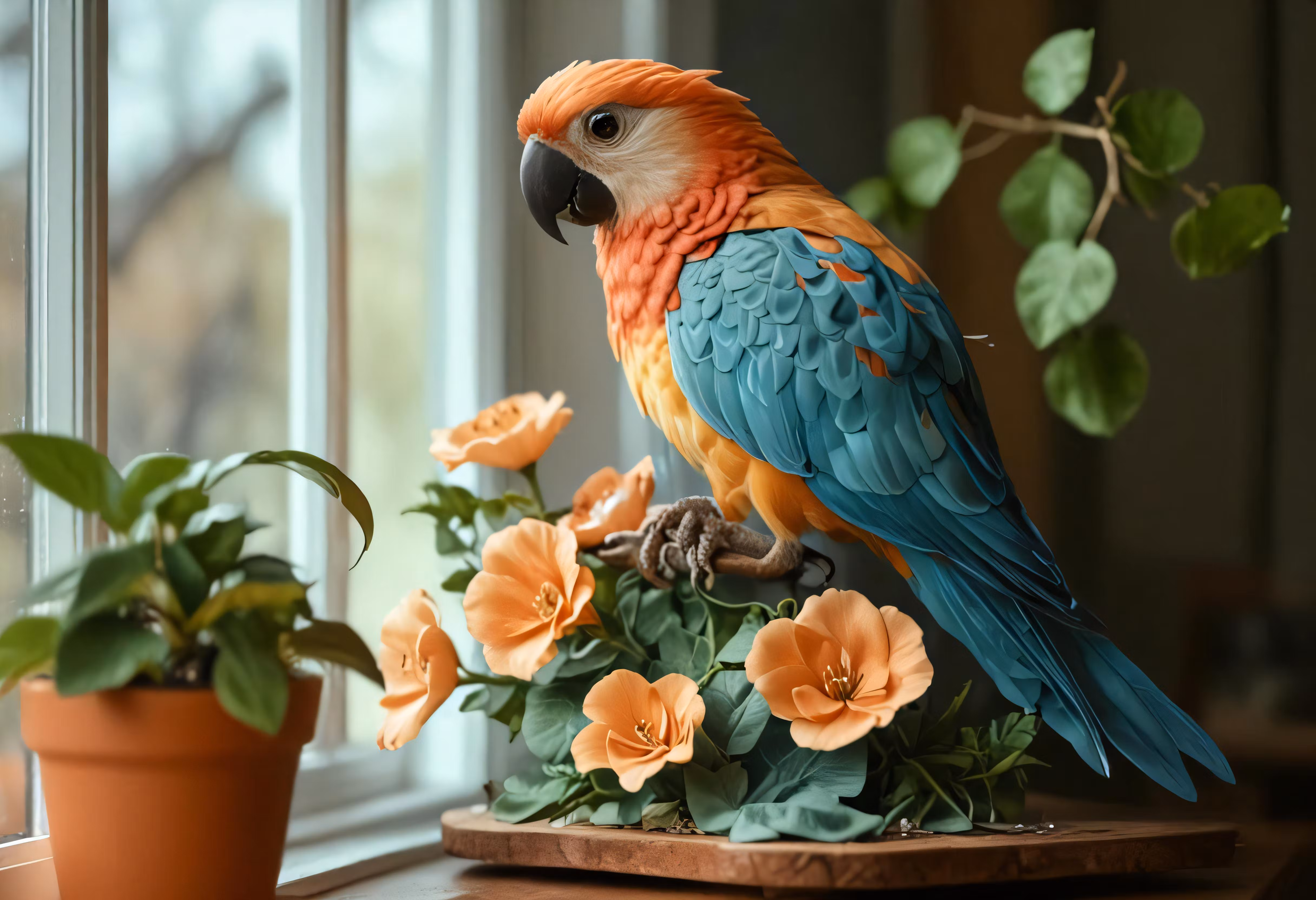 High resolution picture, free to use, an orange and blue bird sitting on a small wood block next to some flowers