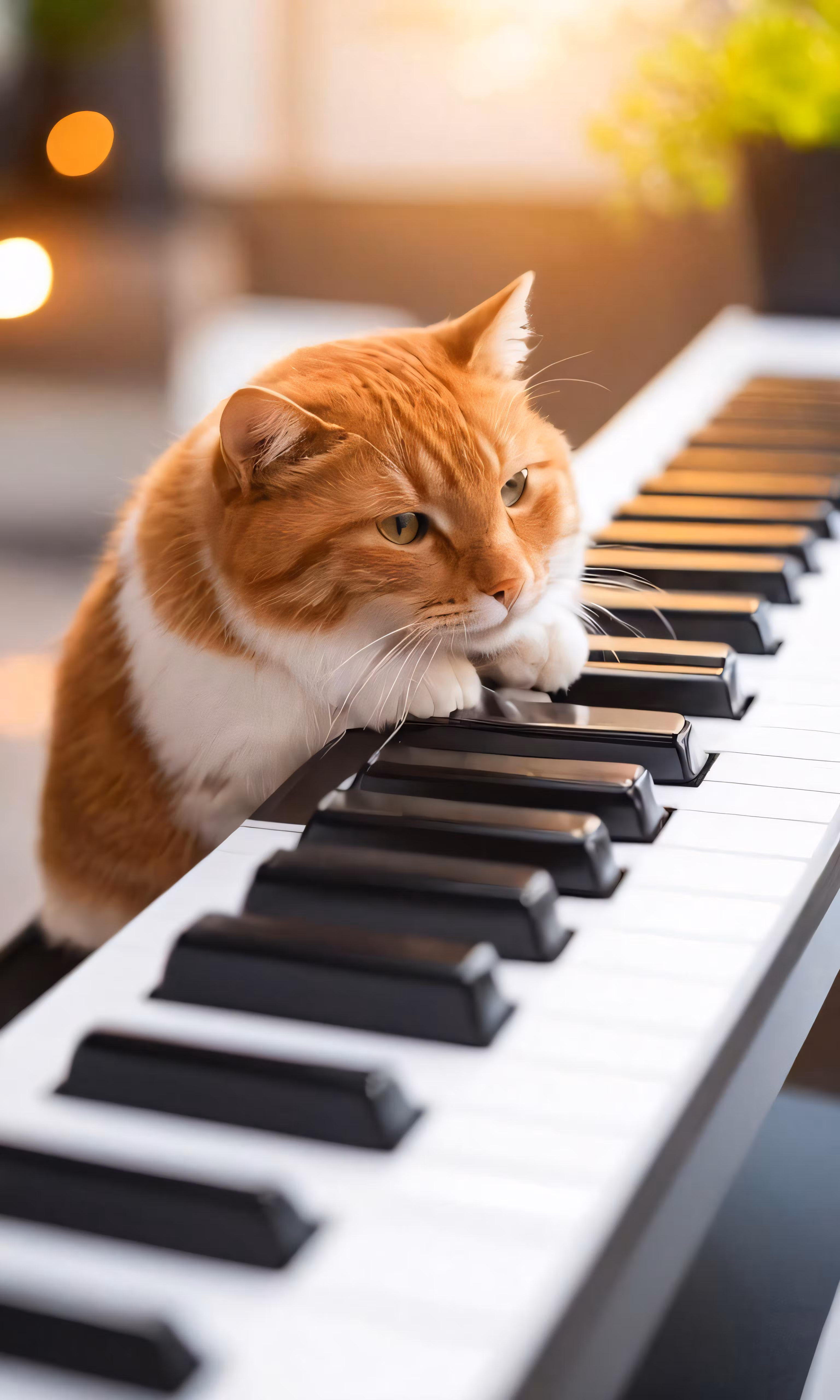 High resolution picture, free to use, an orange and white cat sits at a piano