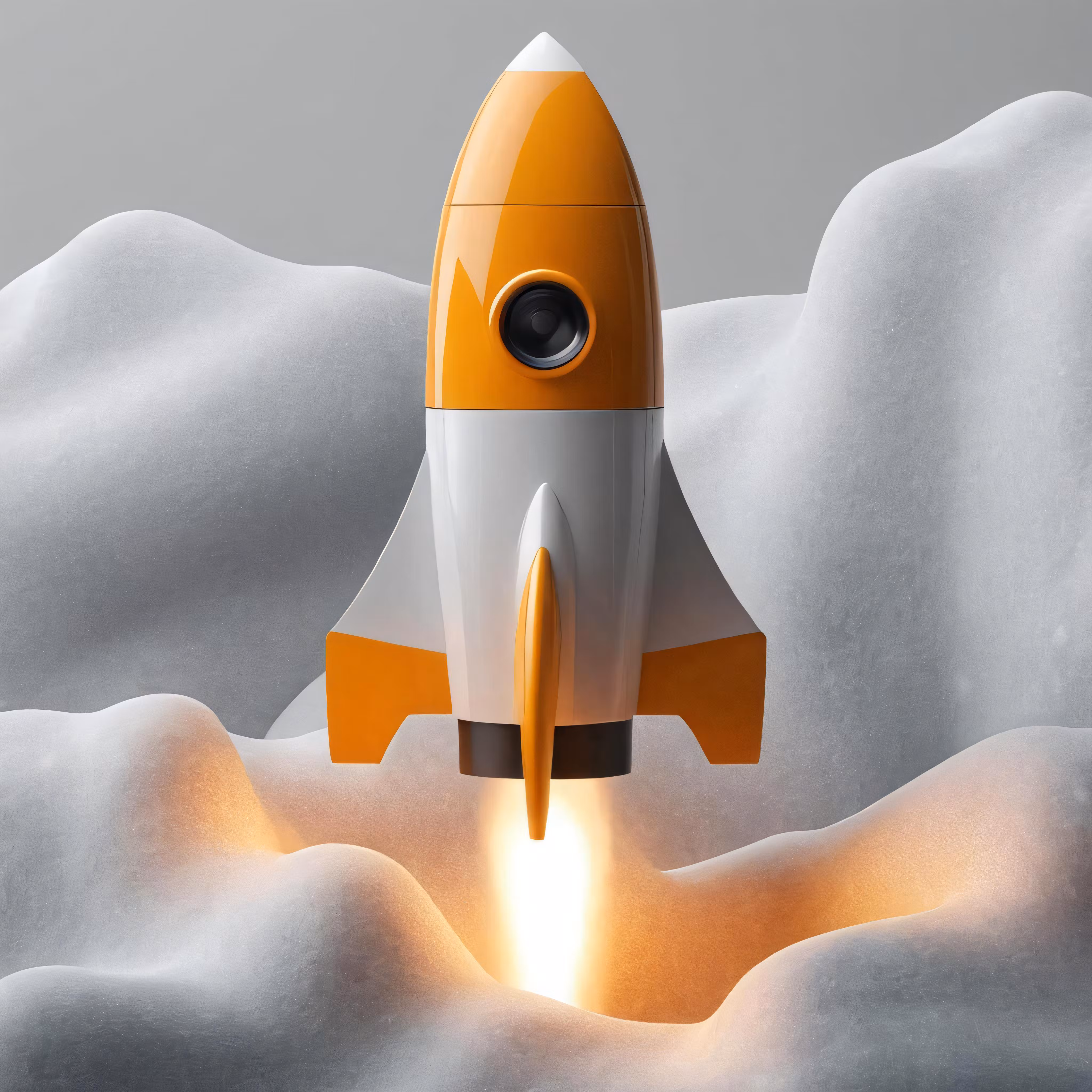 High resolution picture, free to use, an orange and white toy rocket taking off from a white blanket
