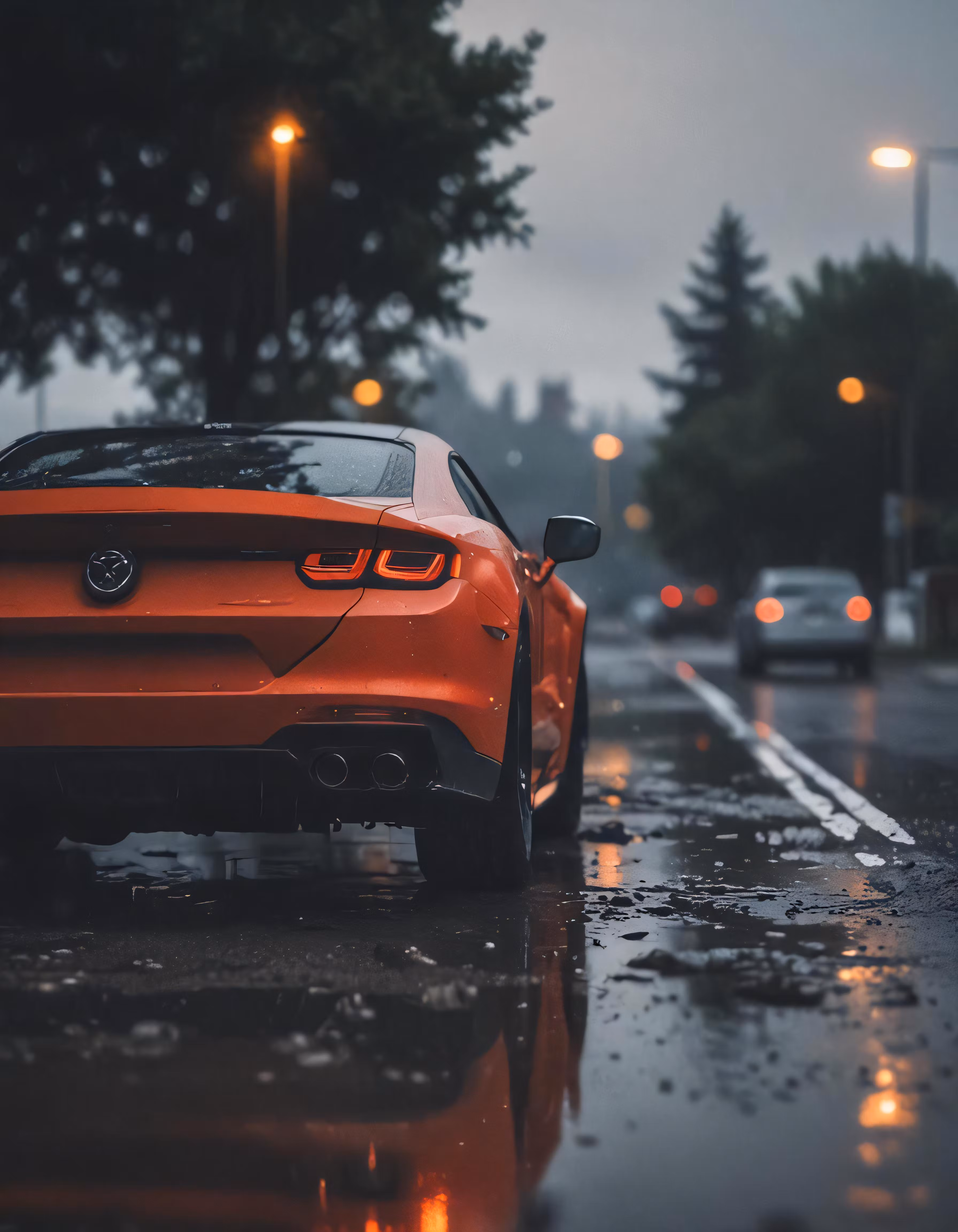 High resolution picture, free to use, an orange car parked on a wet road