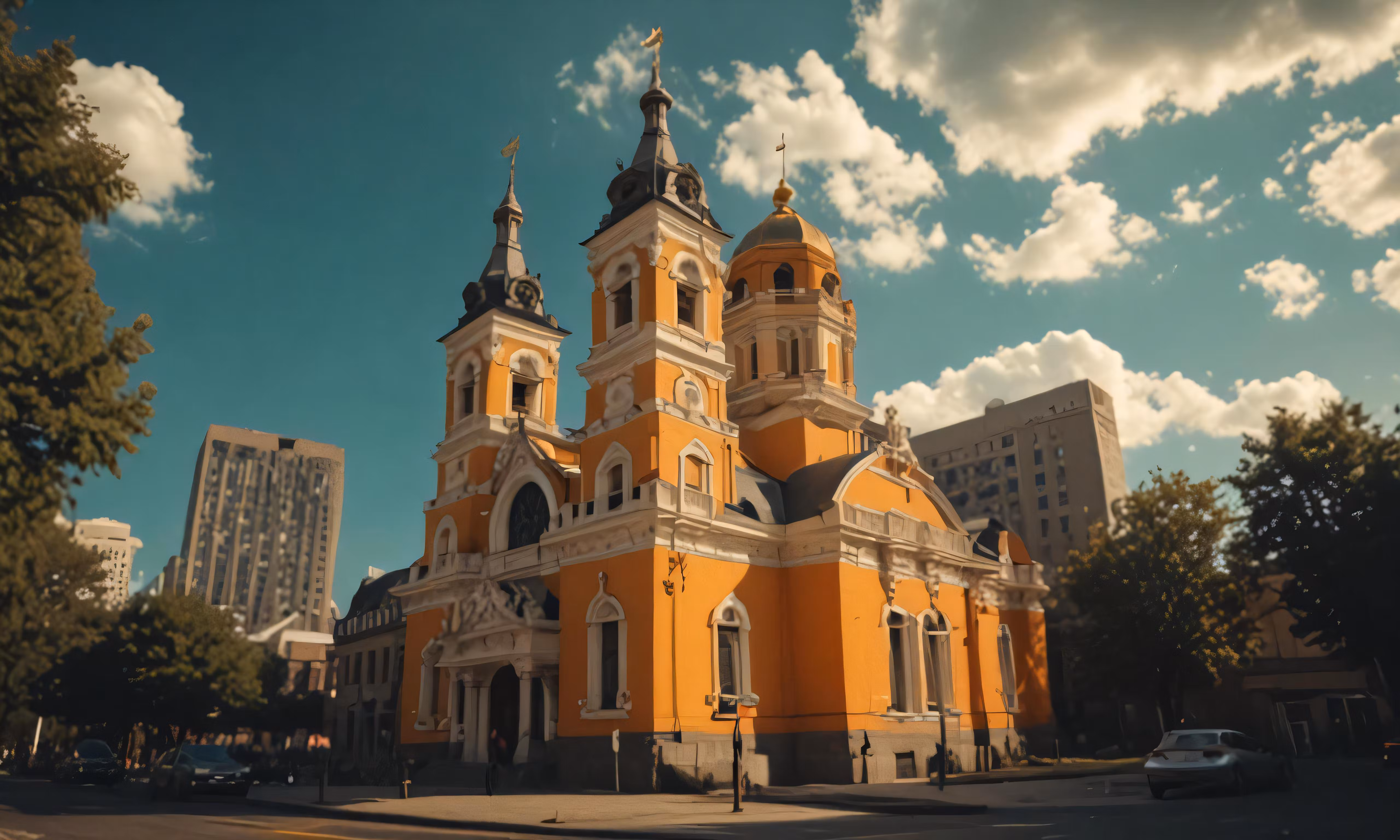 High resolution picture, free to use, an orange church with tall spires in the middle of city