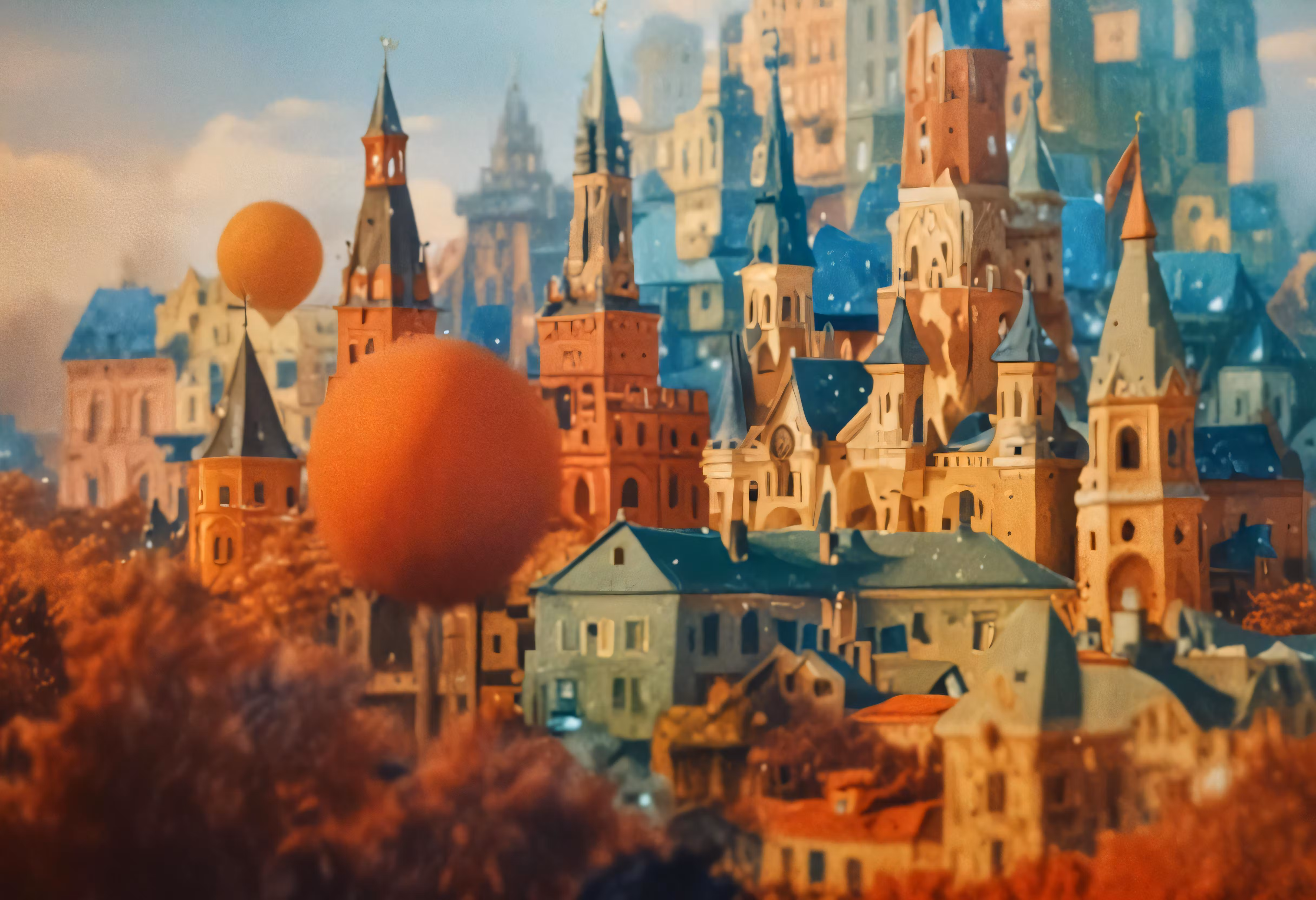 High resolution picture, free to use, an orange is flying over a picture of an old town