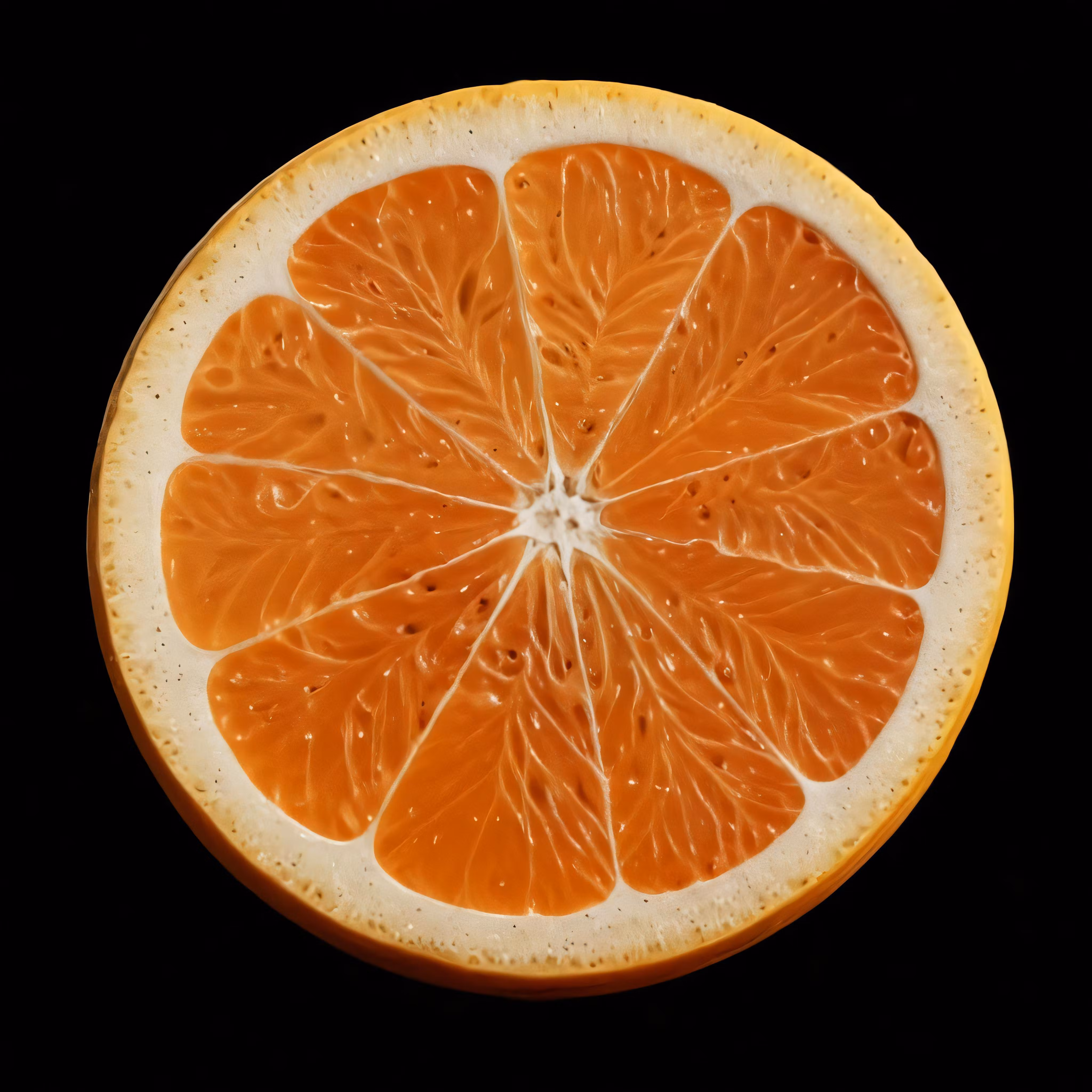 High resolution picture, free to use, an orange is shown sliced in half on a black background