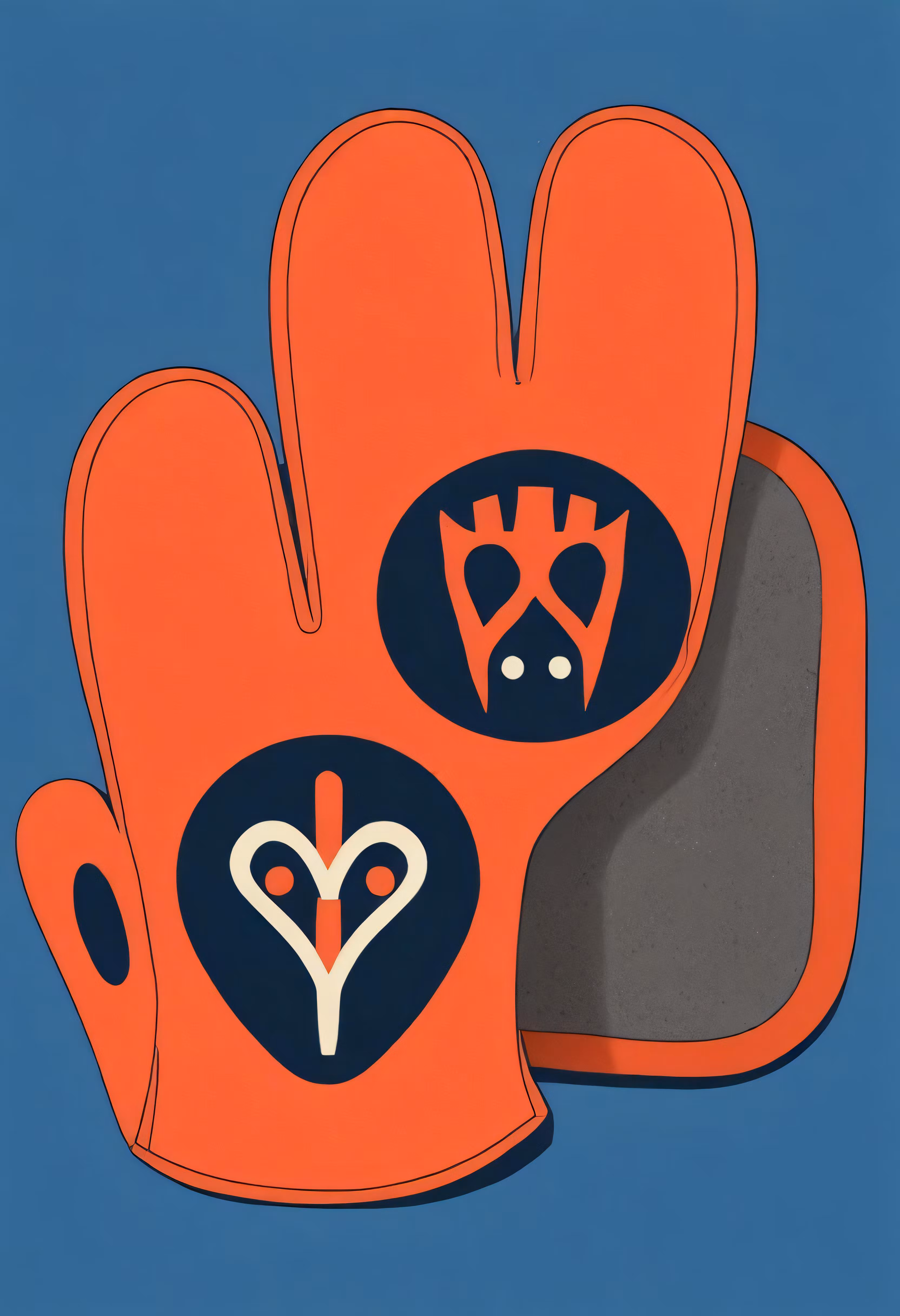 High resolution picture, free to use, an orange oven mitt sitting on top of a blue wall