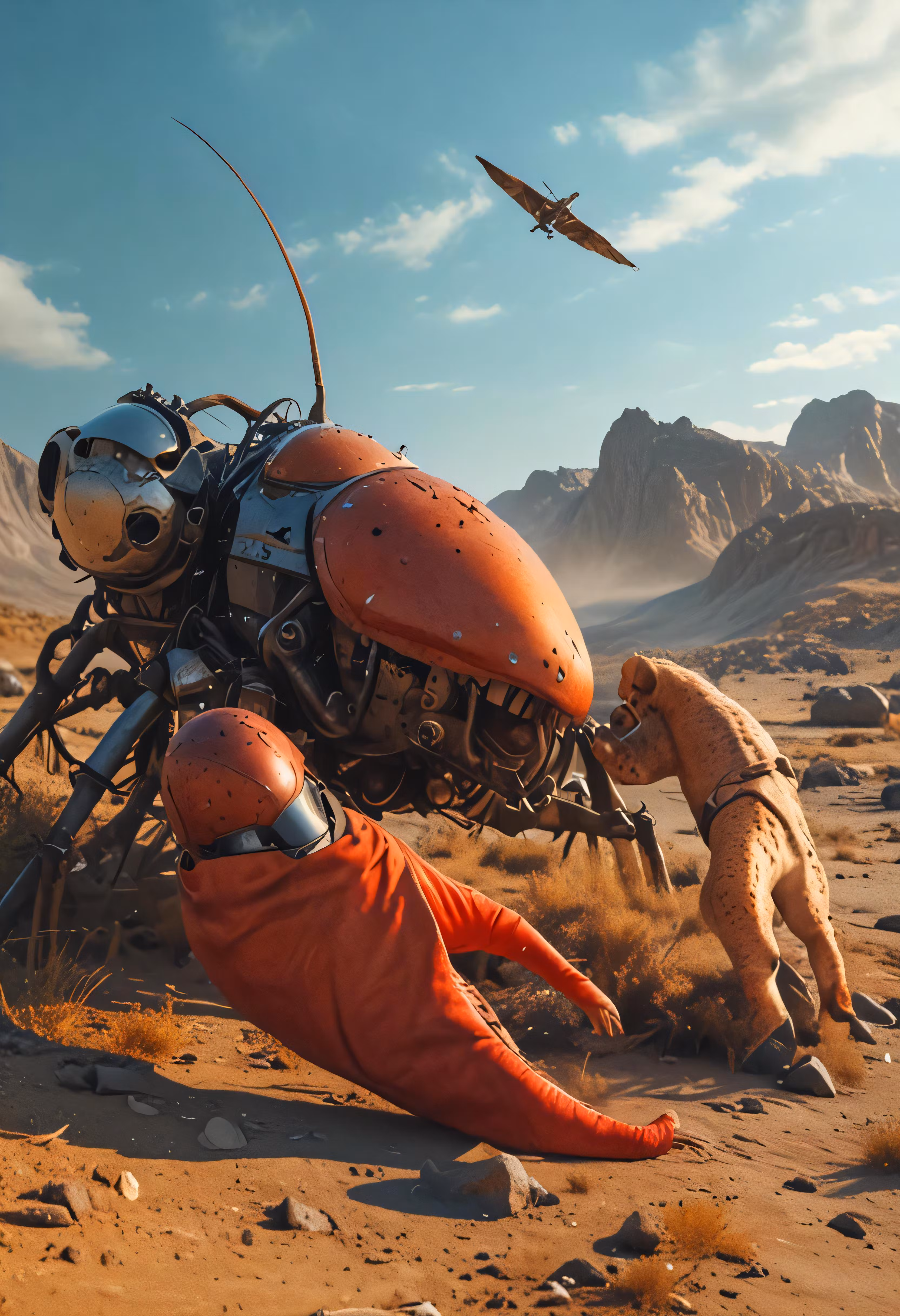 High resolution picture, free to use, an orange sculpture of a creature sitting on top of another one