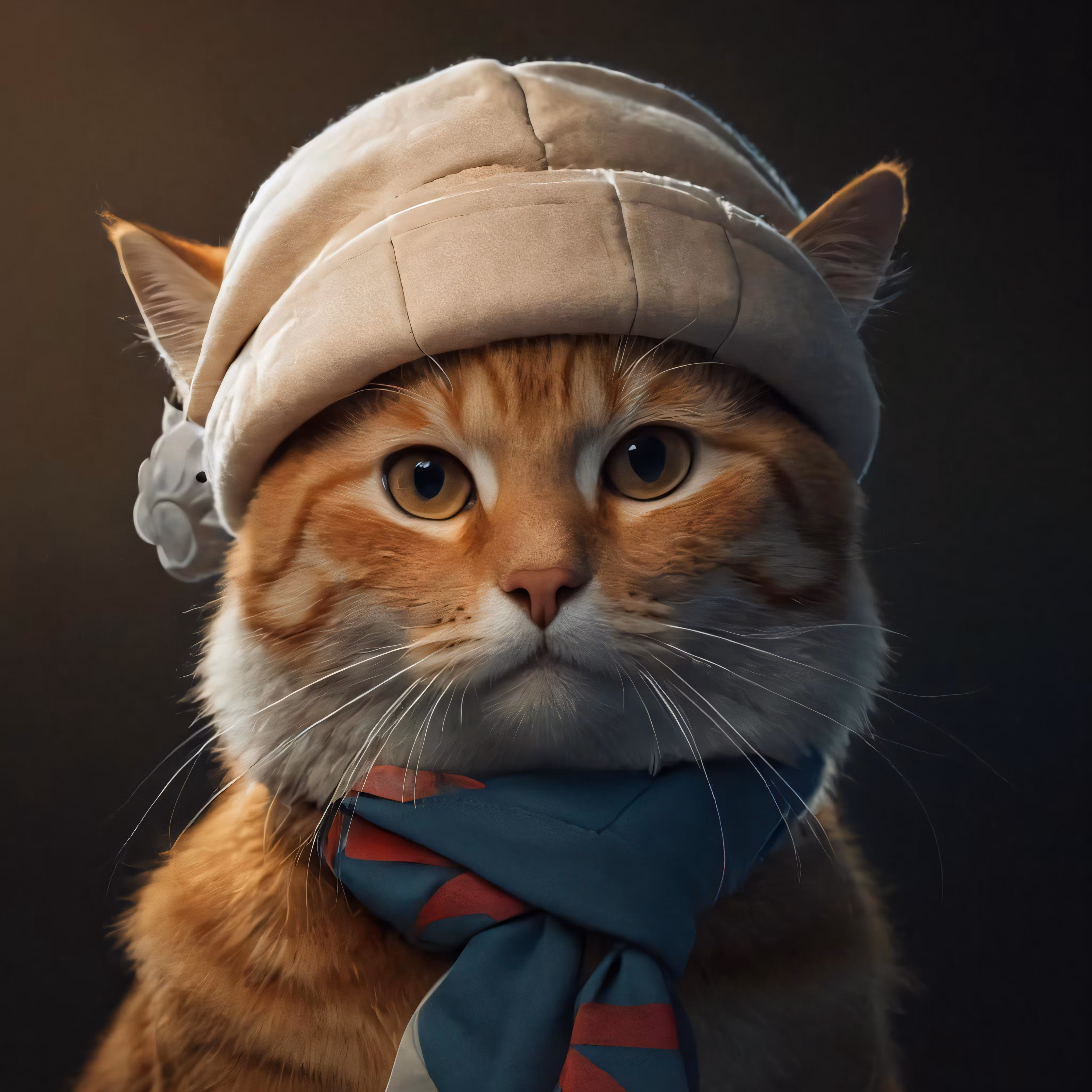 High resolution picture, free to use, an orange tabby cat wearing a hat and scarf