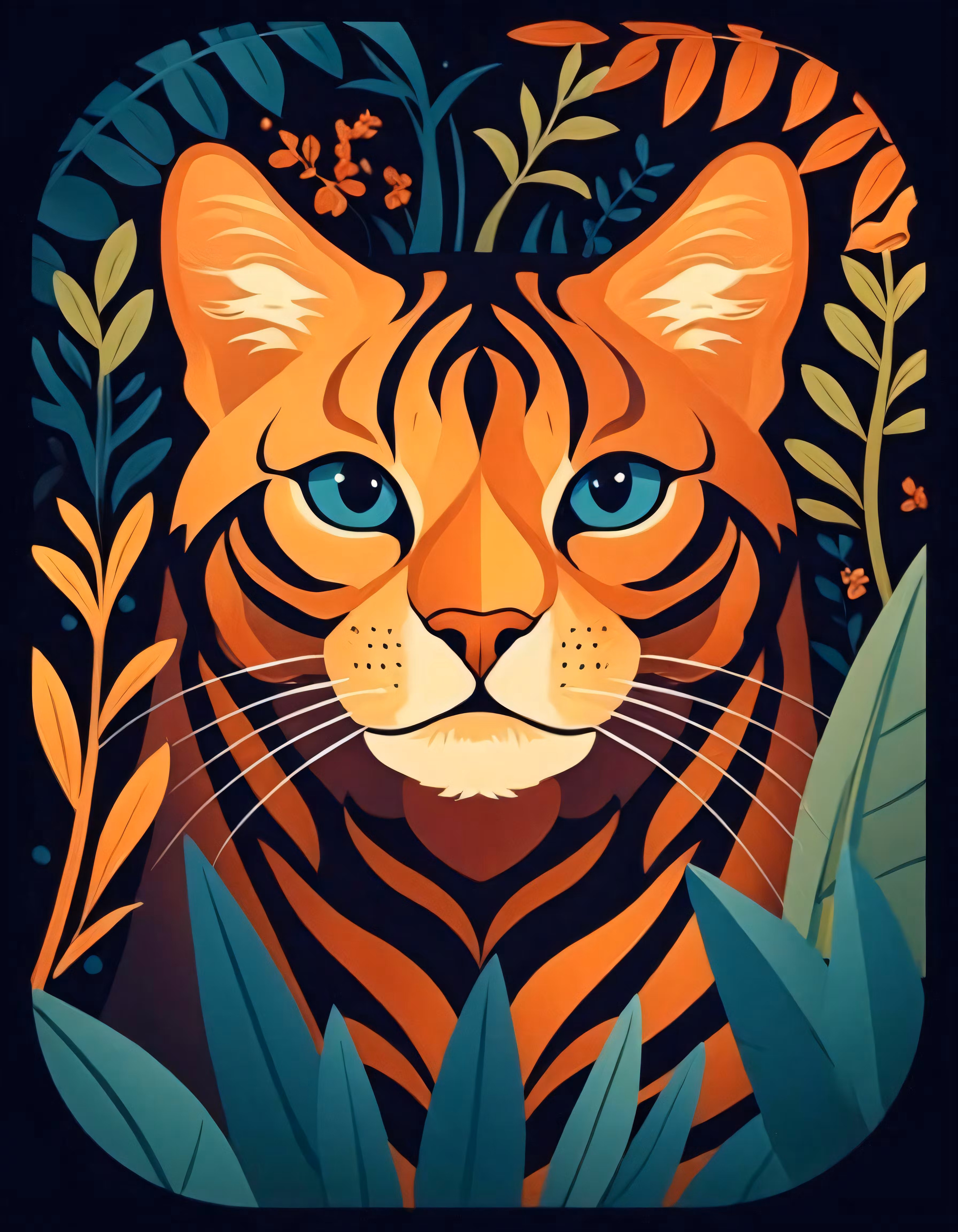 High resolution picture, free to use, an orange tiger with blue eyes surrounded by green plants