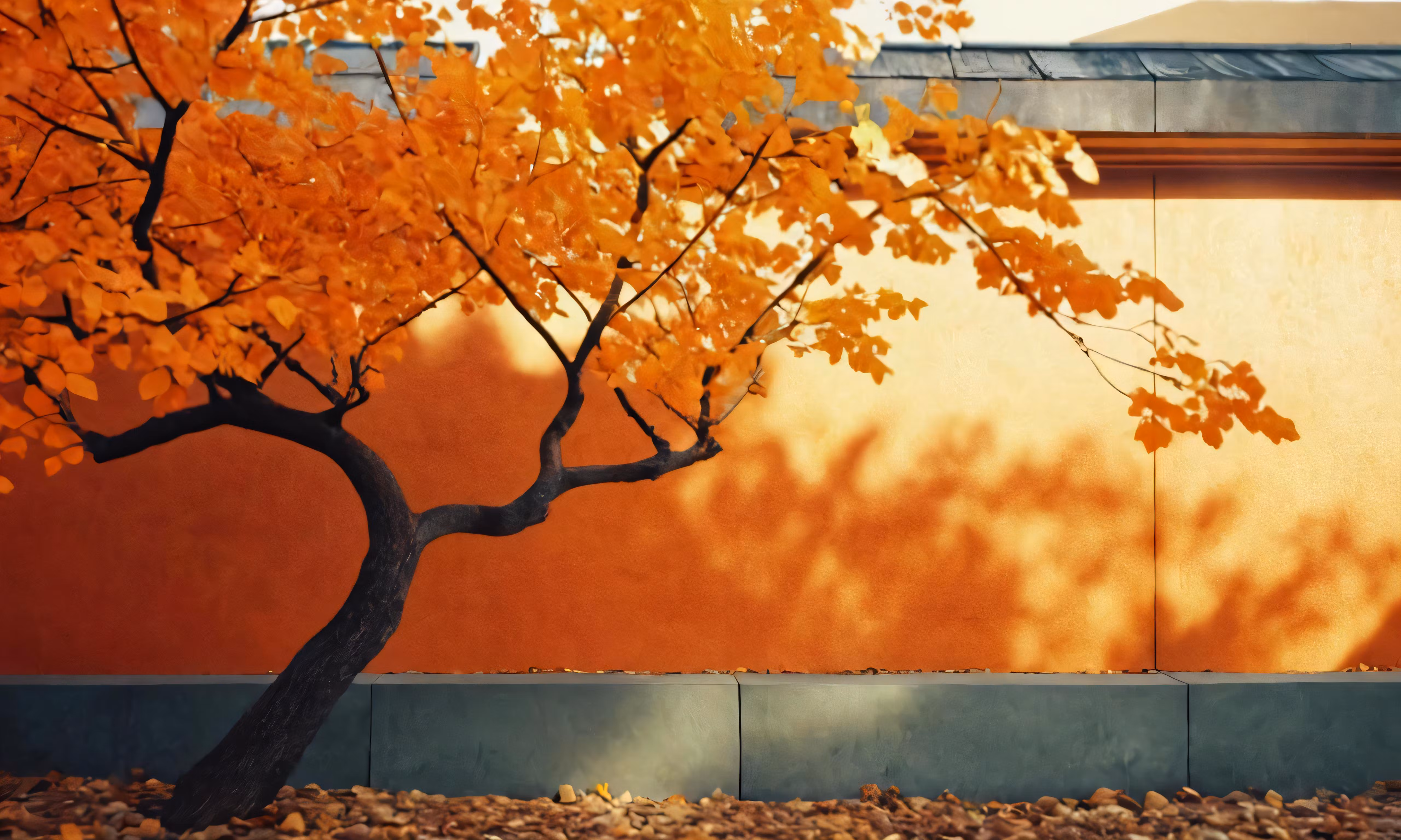 High resolution picture, free to use, an orange tree in front of a tan wall