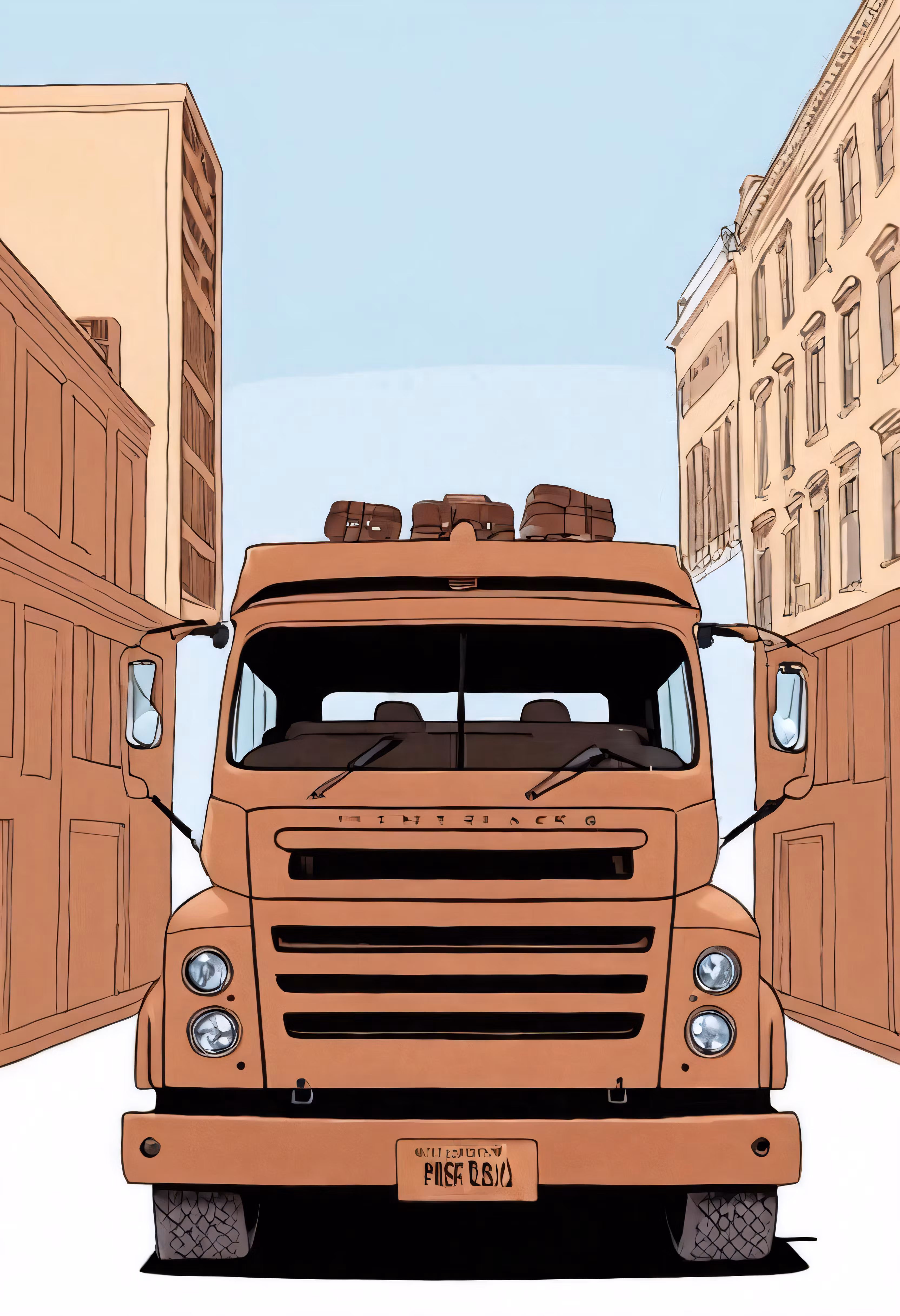 High resolution picture, free to use, an orange truck is going through an open city alleyway