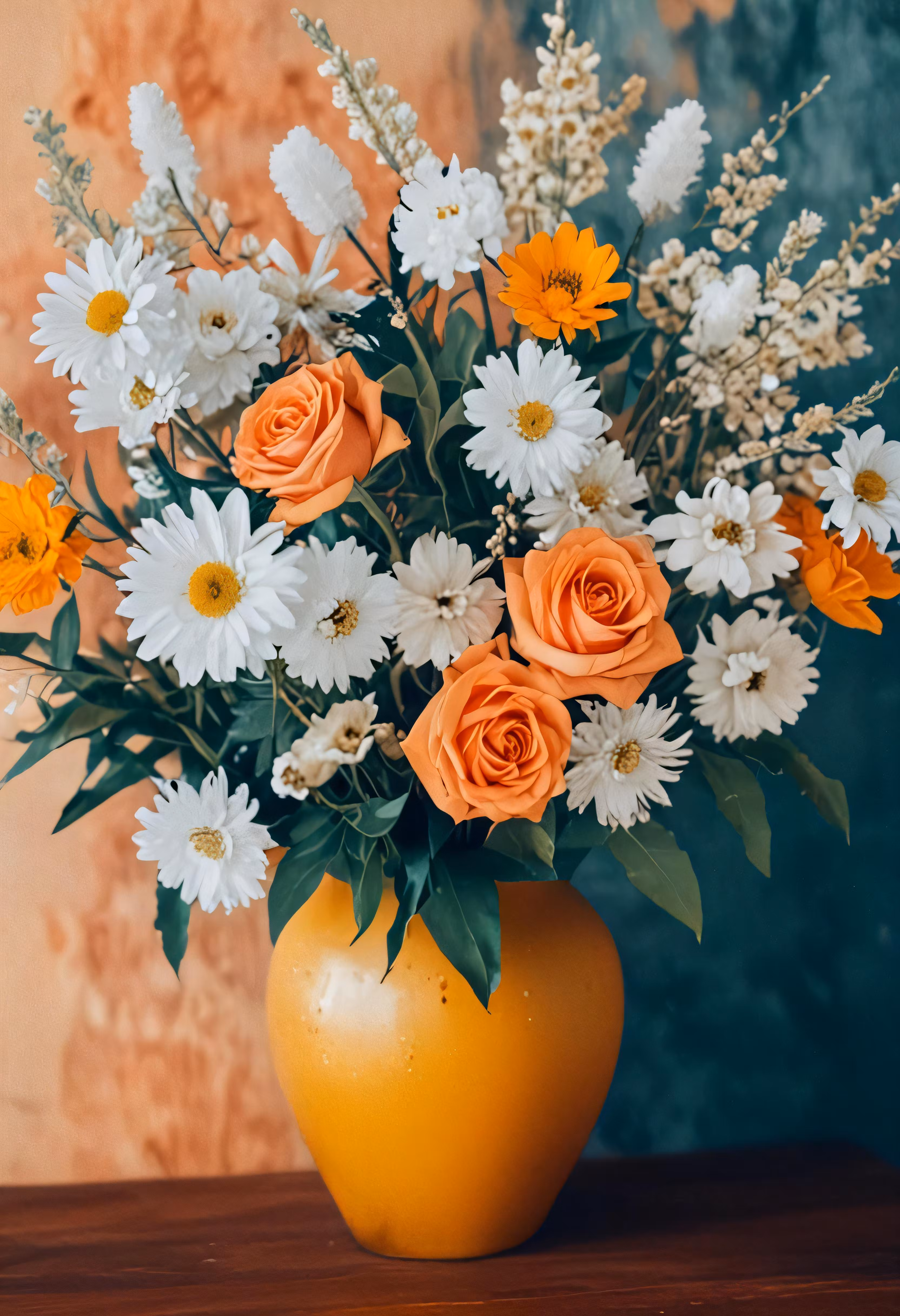 High resolution picture, free to use, an orange vase holds a variety of flowers