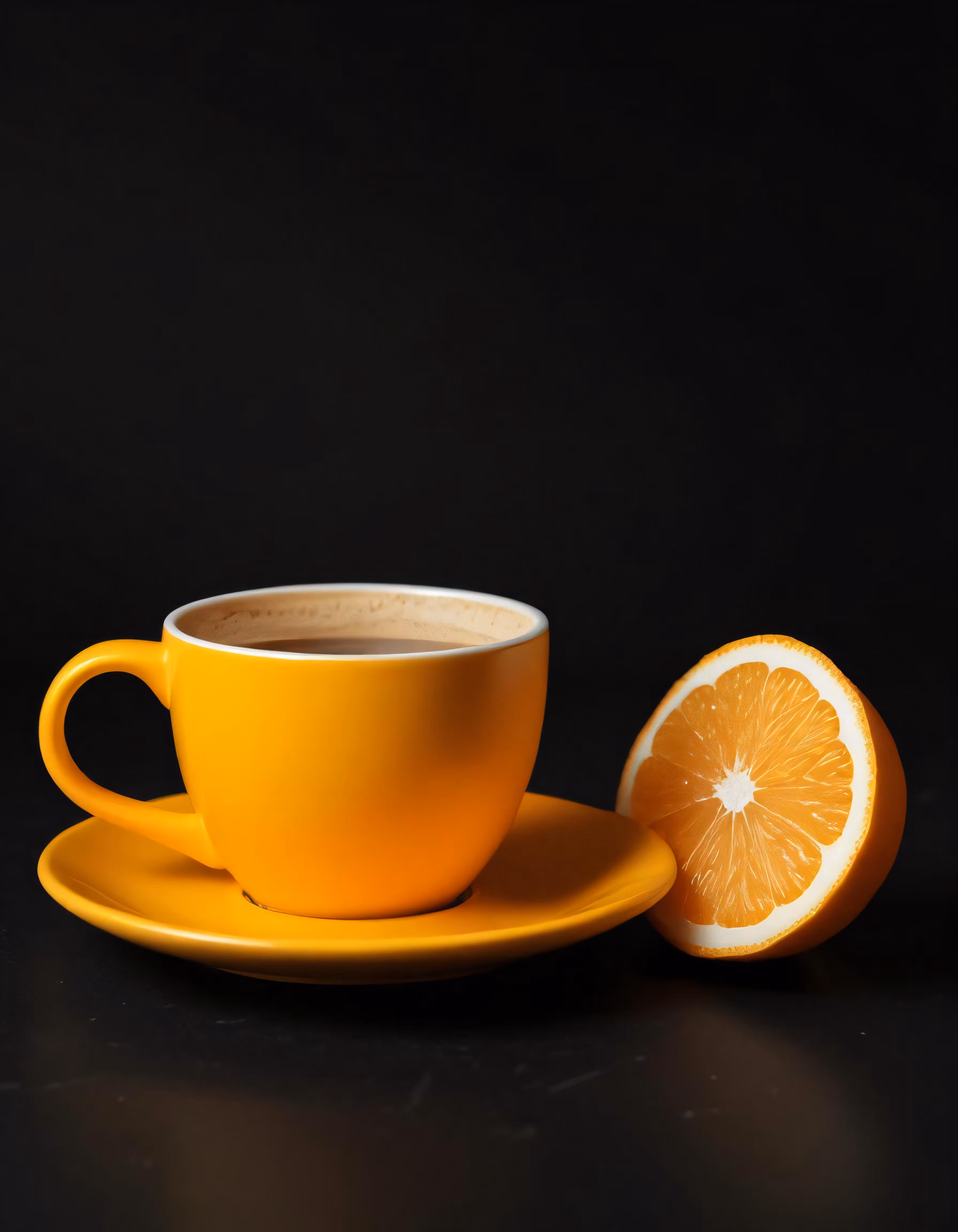 High resolution picture, free to use, an orange wedge on a small saucer next to a cup