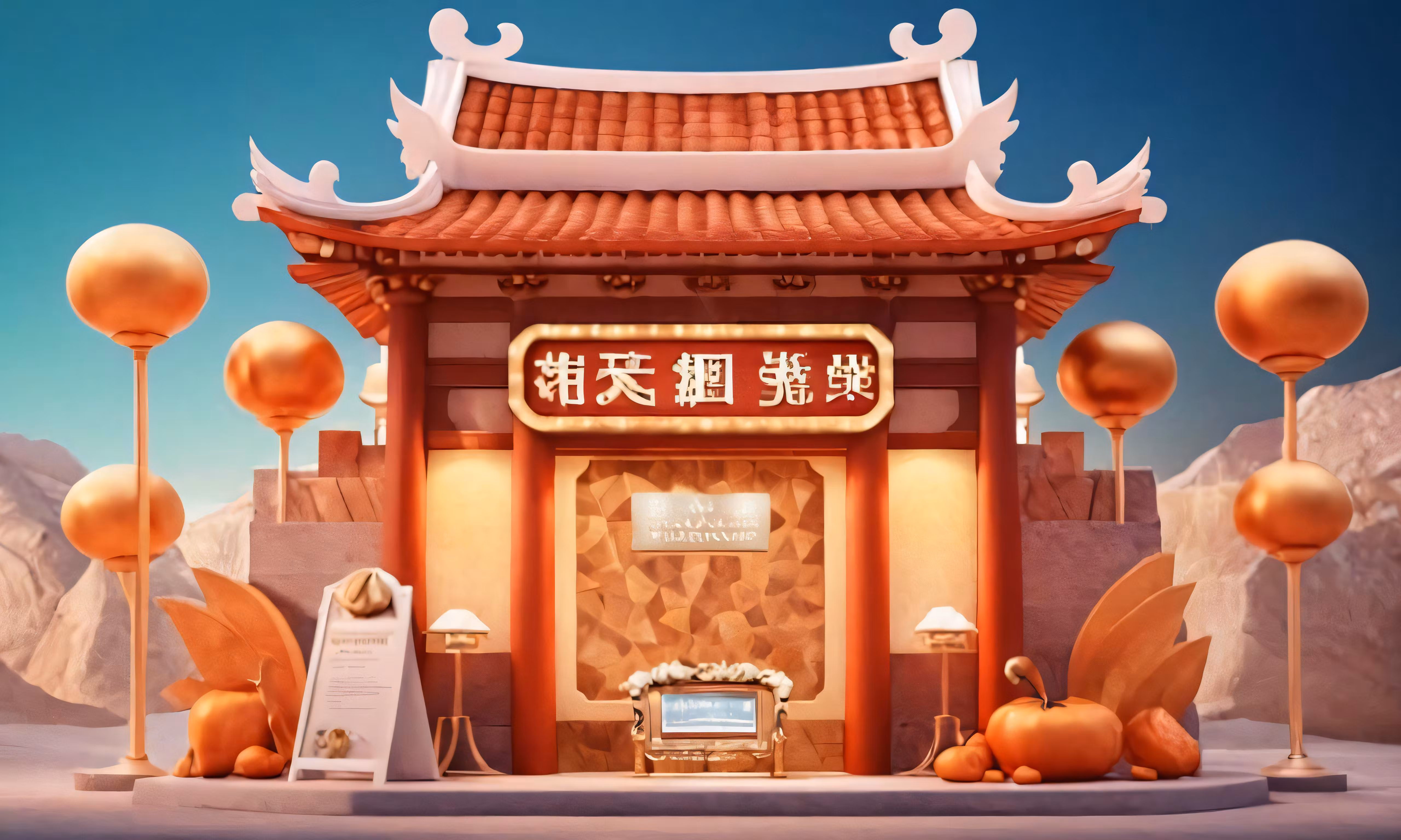 High resolution picture, free to use, an oriental building with gold balloons around it