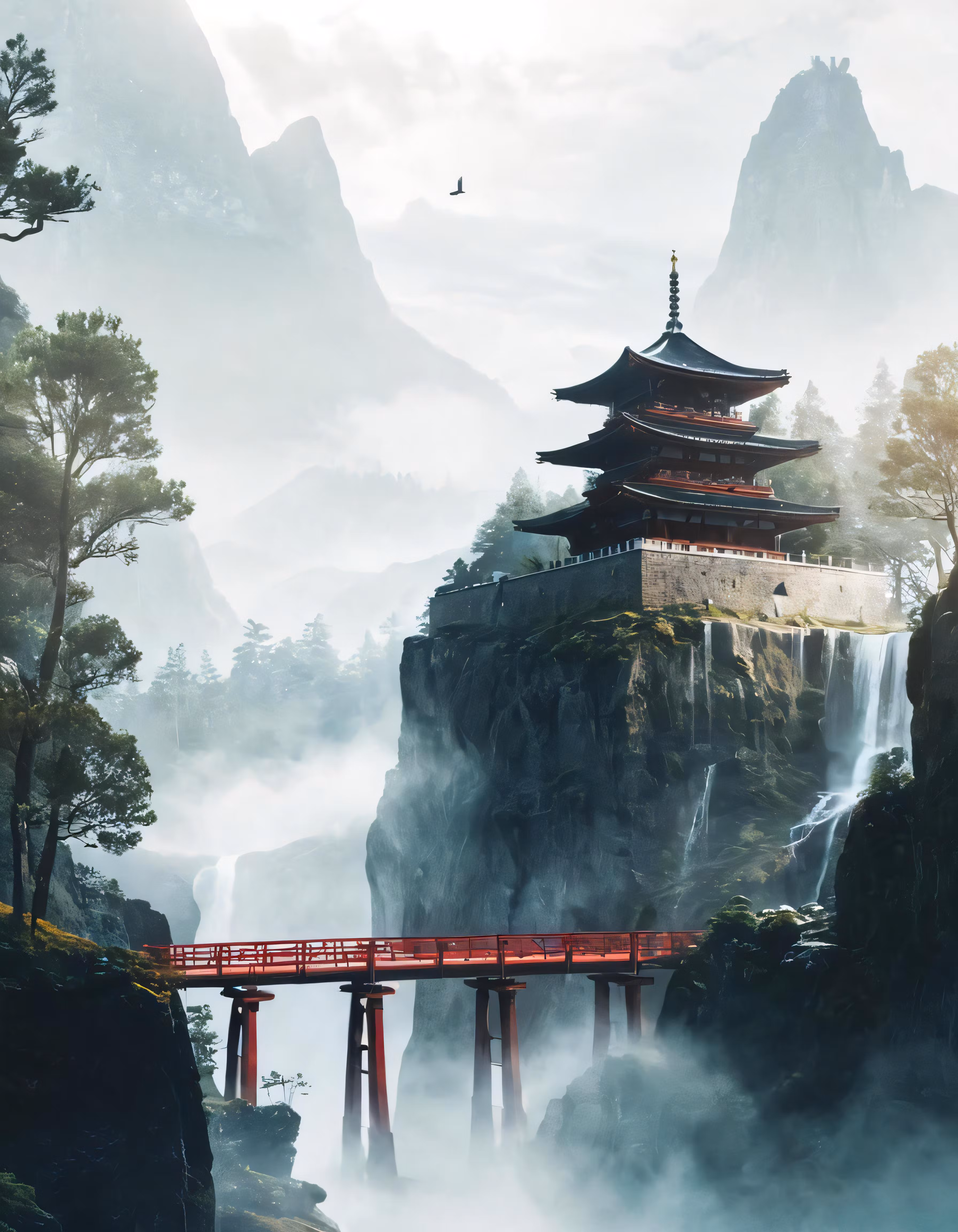High resolution picture, free to use, an oriental landscape, with a bridge and large mountain