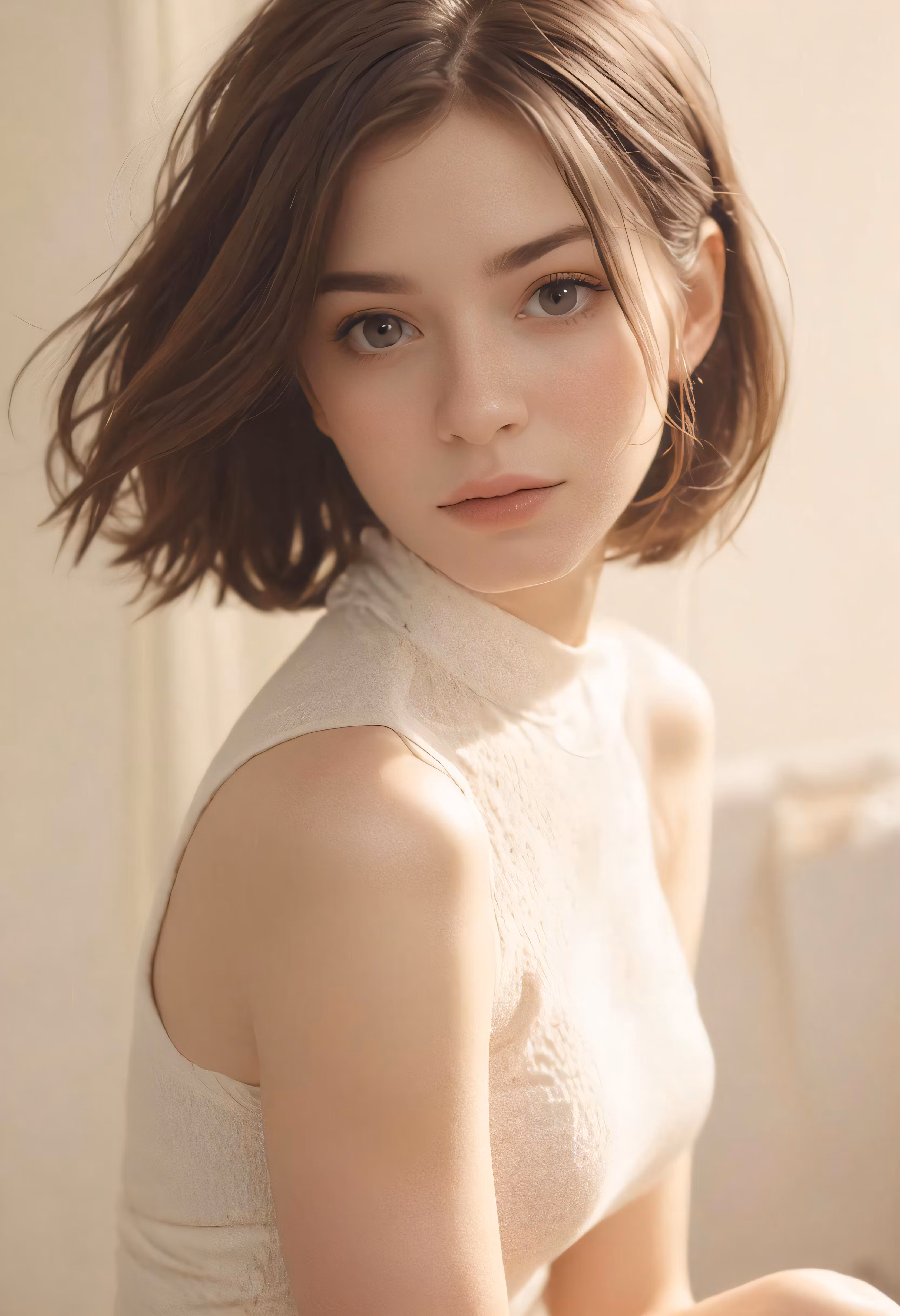 High resolution picture, free to use, an oriental model with short hair sitting on a chair