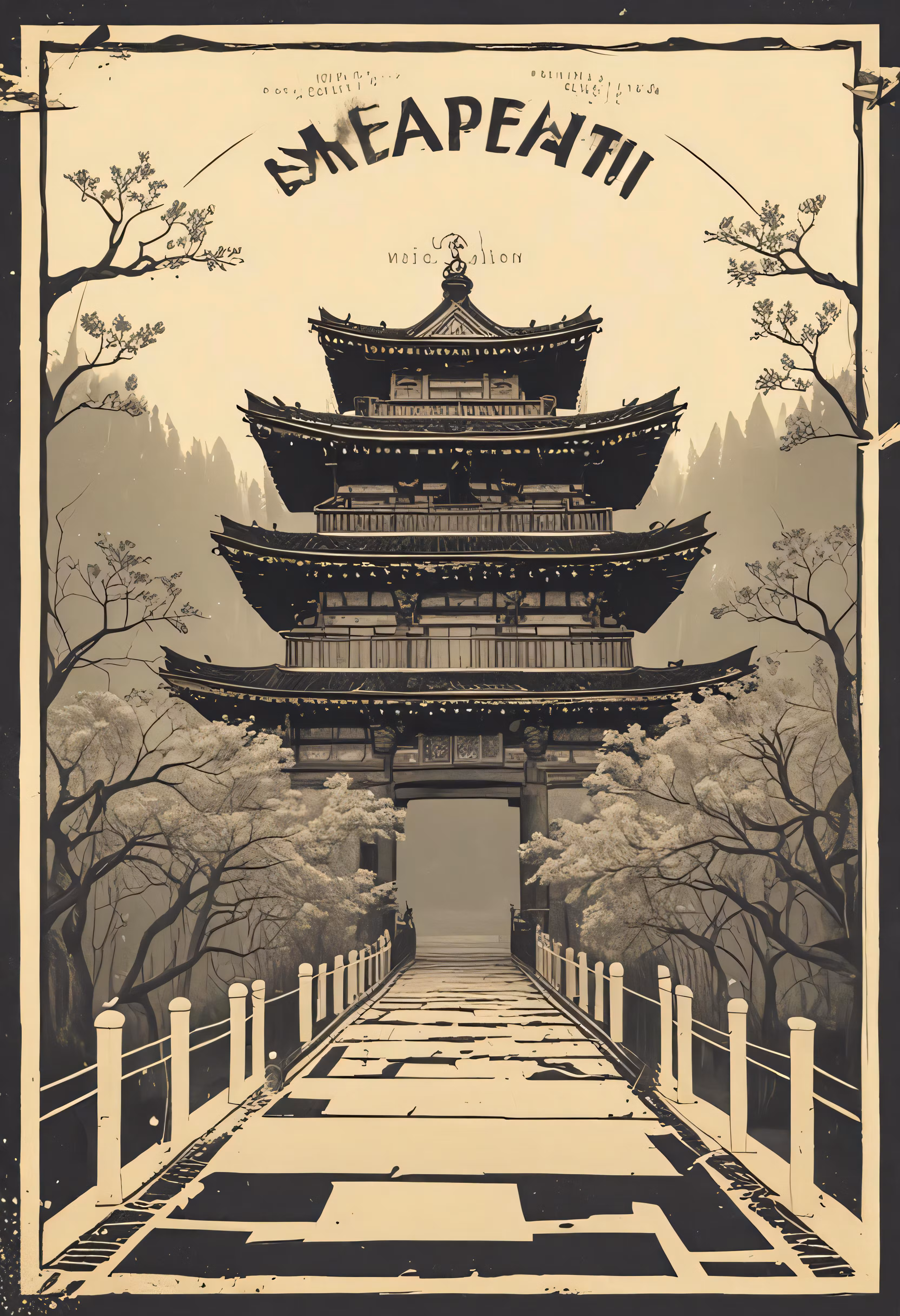 High resolution picture, free to use, an oriental poster in beige tones with a pagoda on the top of it