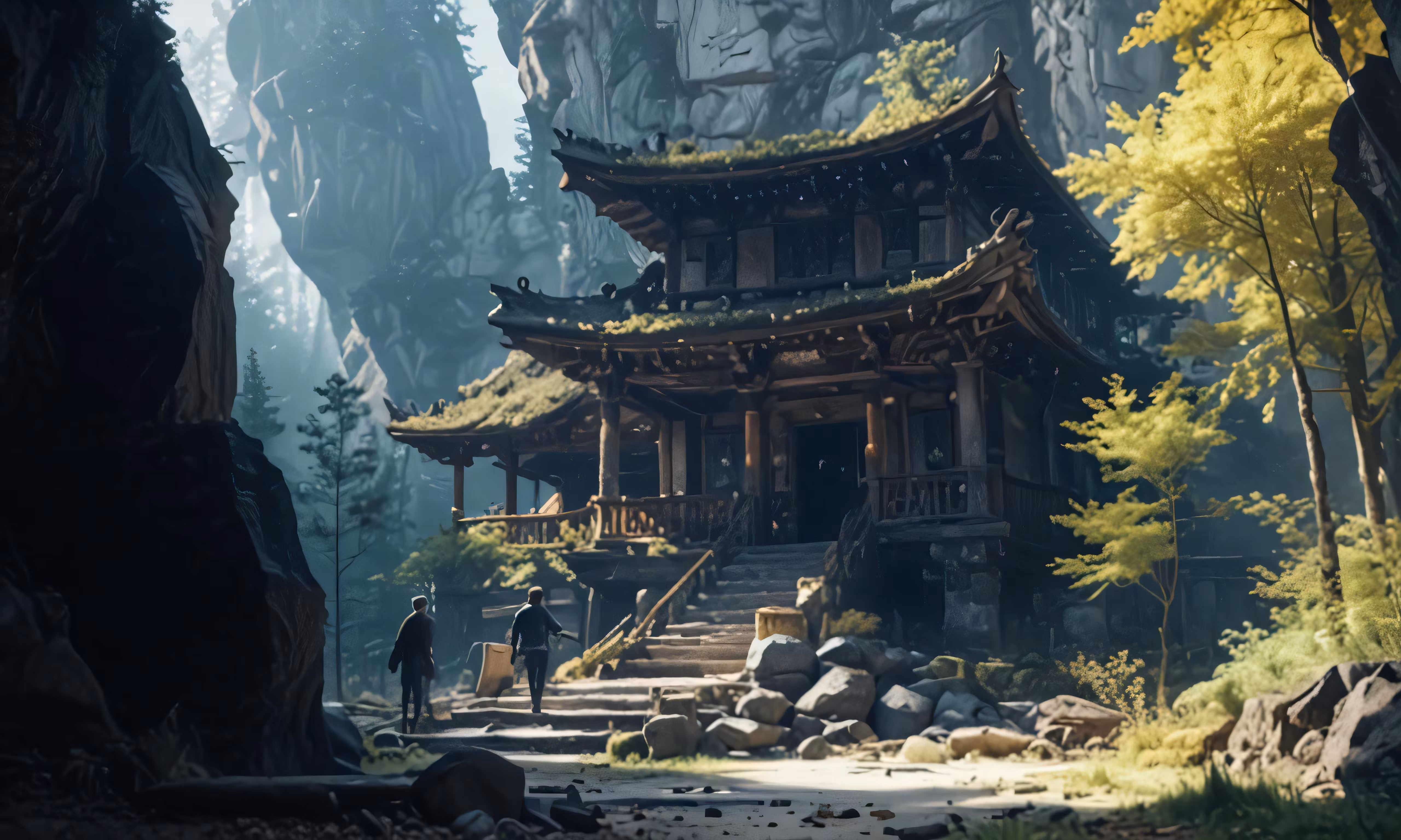 High resolution picture, free to use, an oriental style building in the middle of a forest