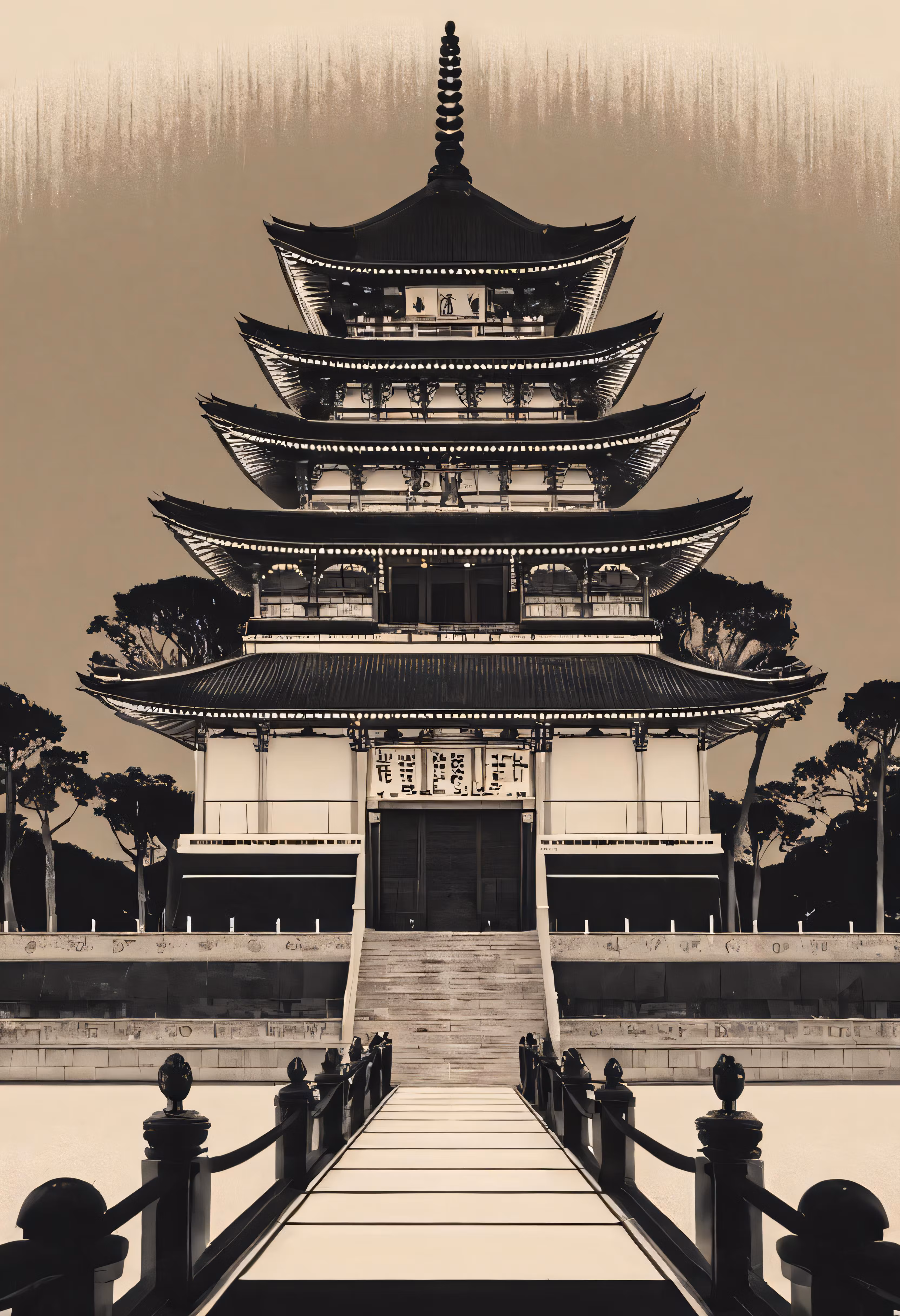 High resolution picture, free to use, an oriental style structure sitting next to a forest