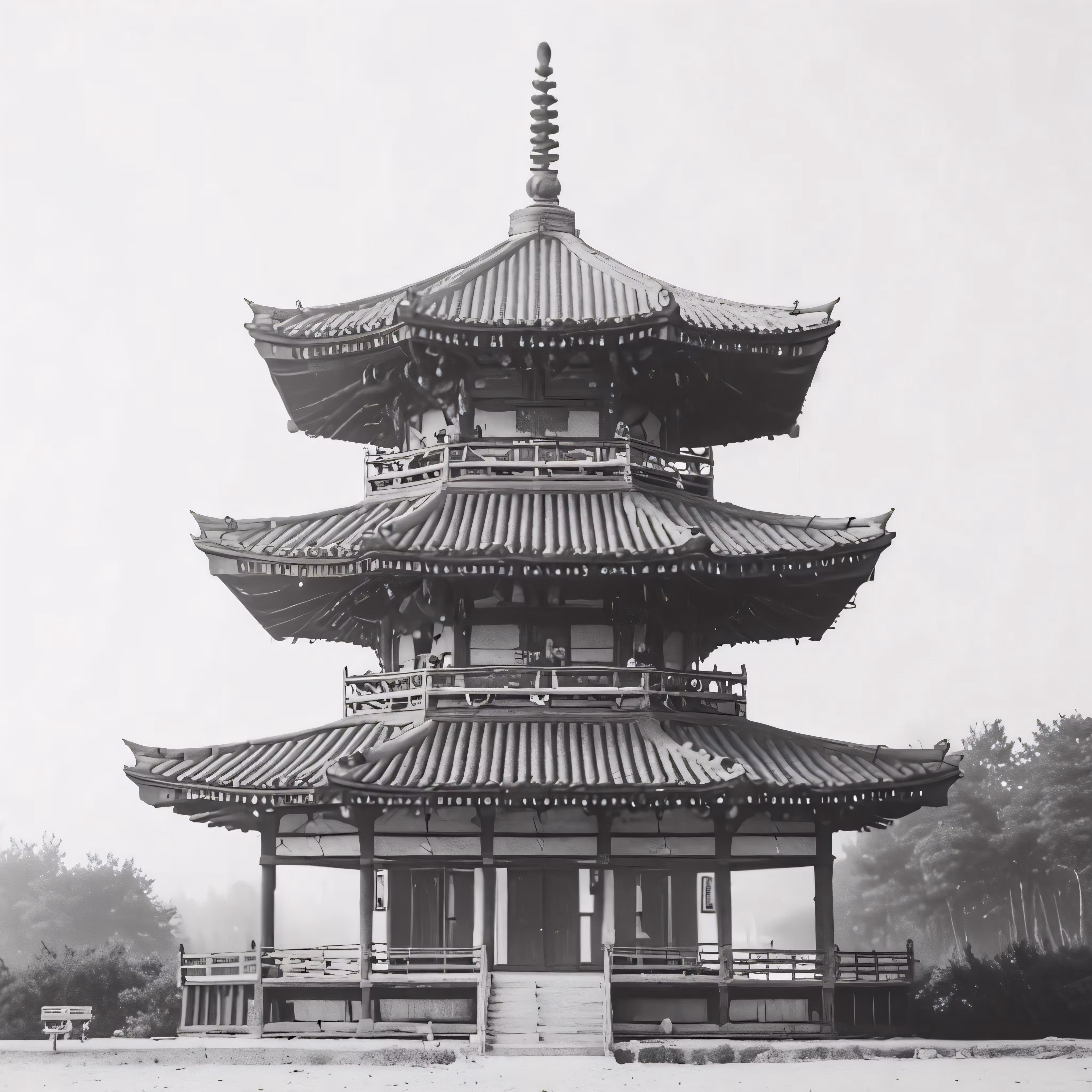 High resolution picture, free to use, an oriental styled building is featured on a foggy day