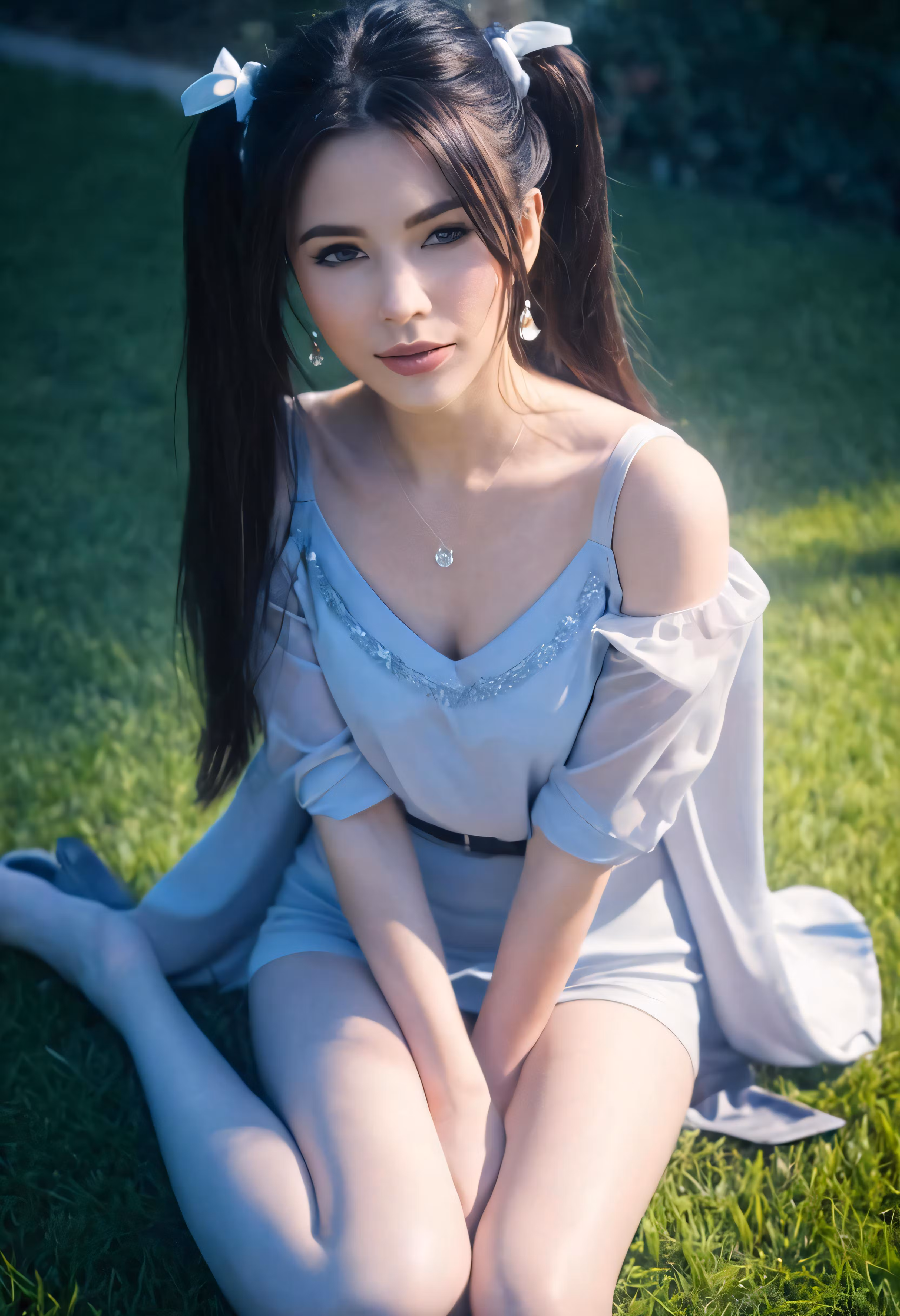 High resolution picture, free to use, an oriental woman in white dress sitting on grass