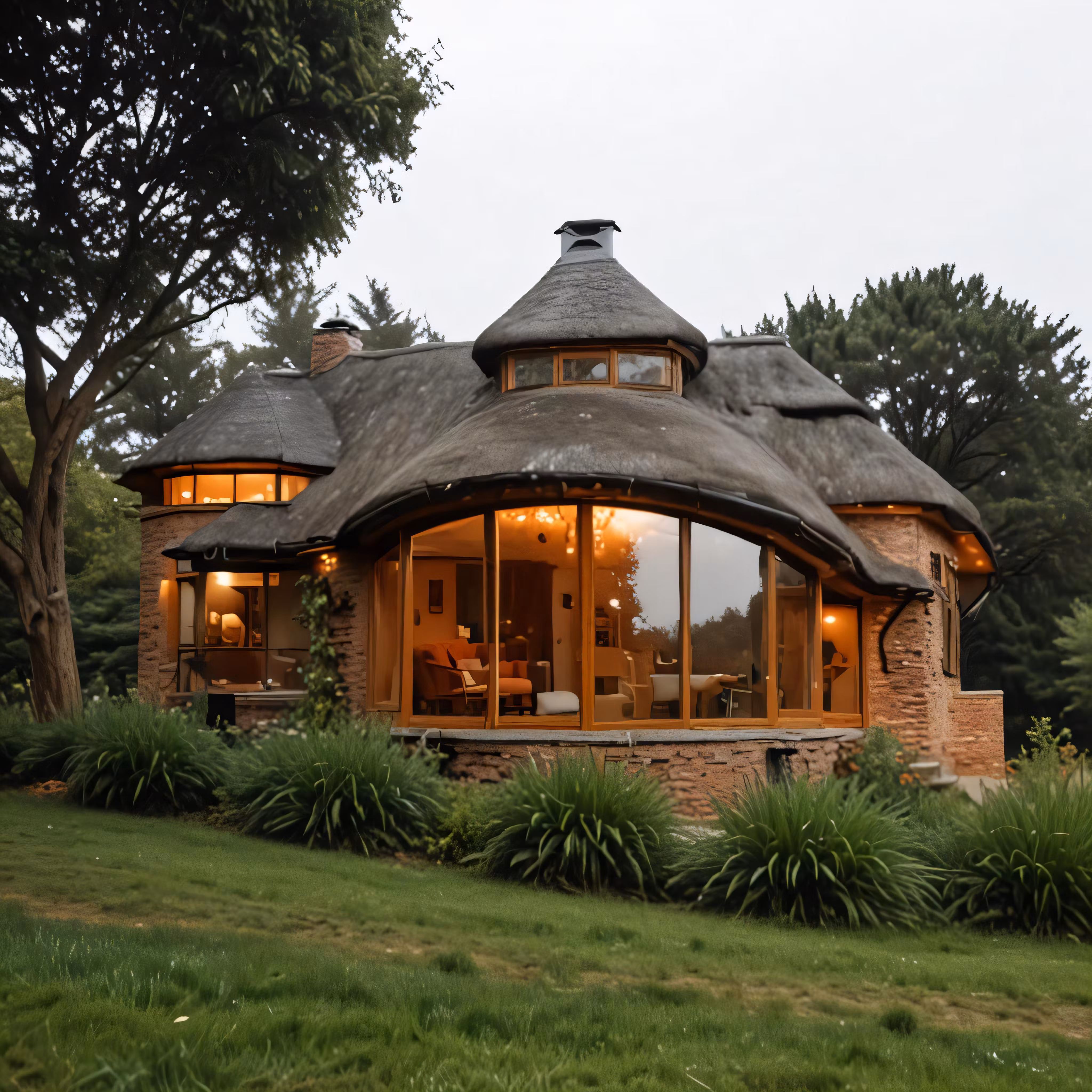 High resolution picture, free to use, an outdoor building with a round roof next to a grassy field