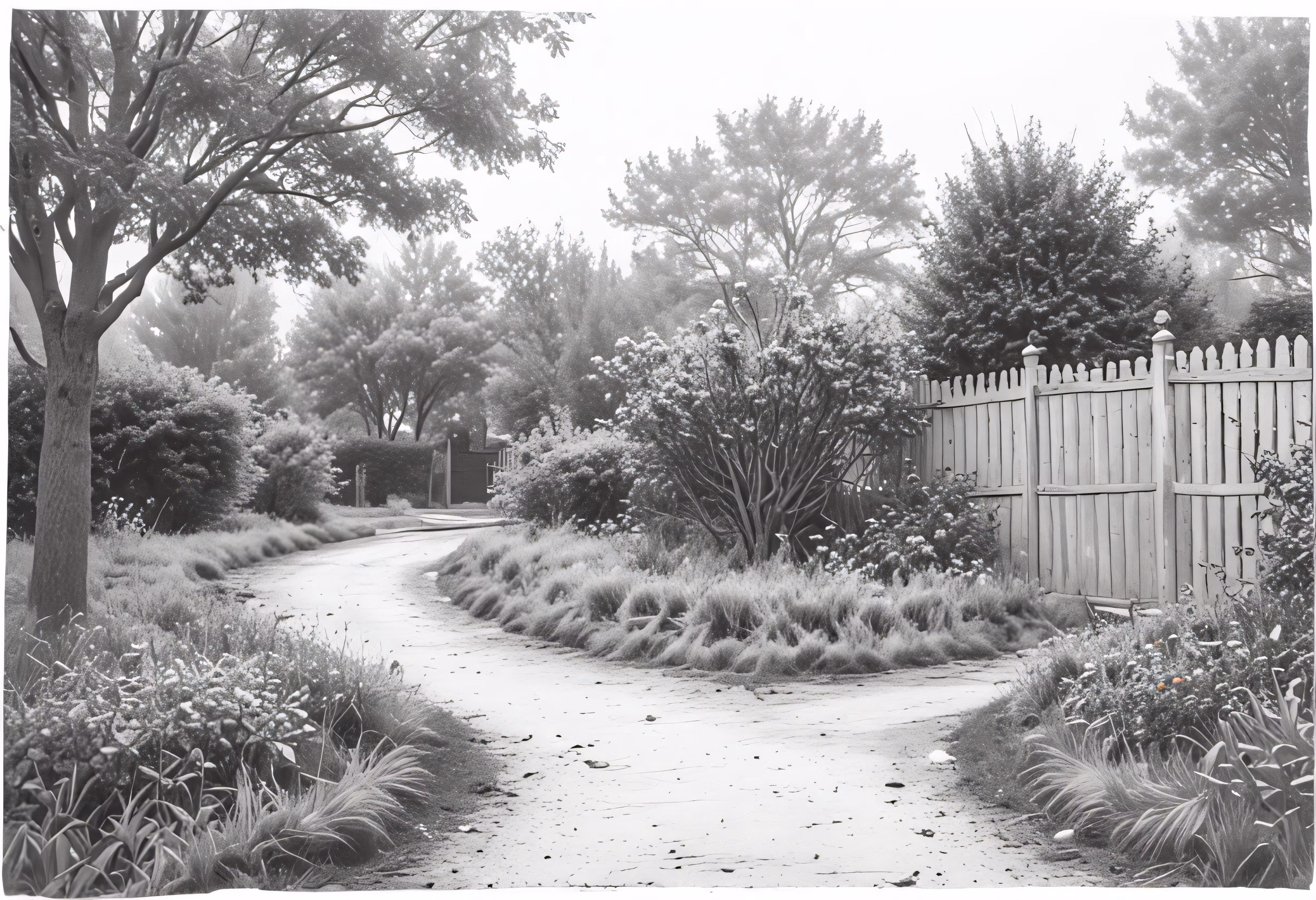 High resolution picture, free to use, an outdoor garden has a path with shrubbery around it