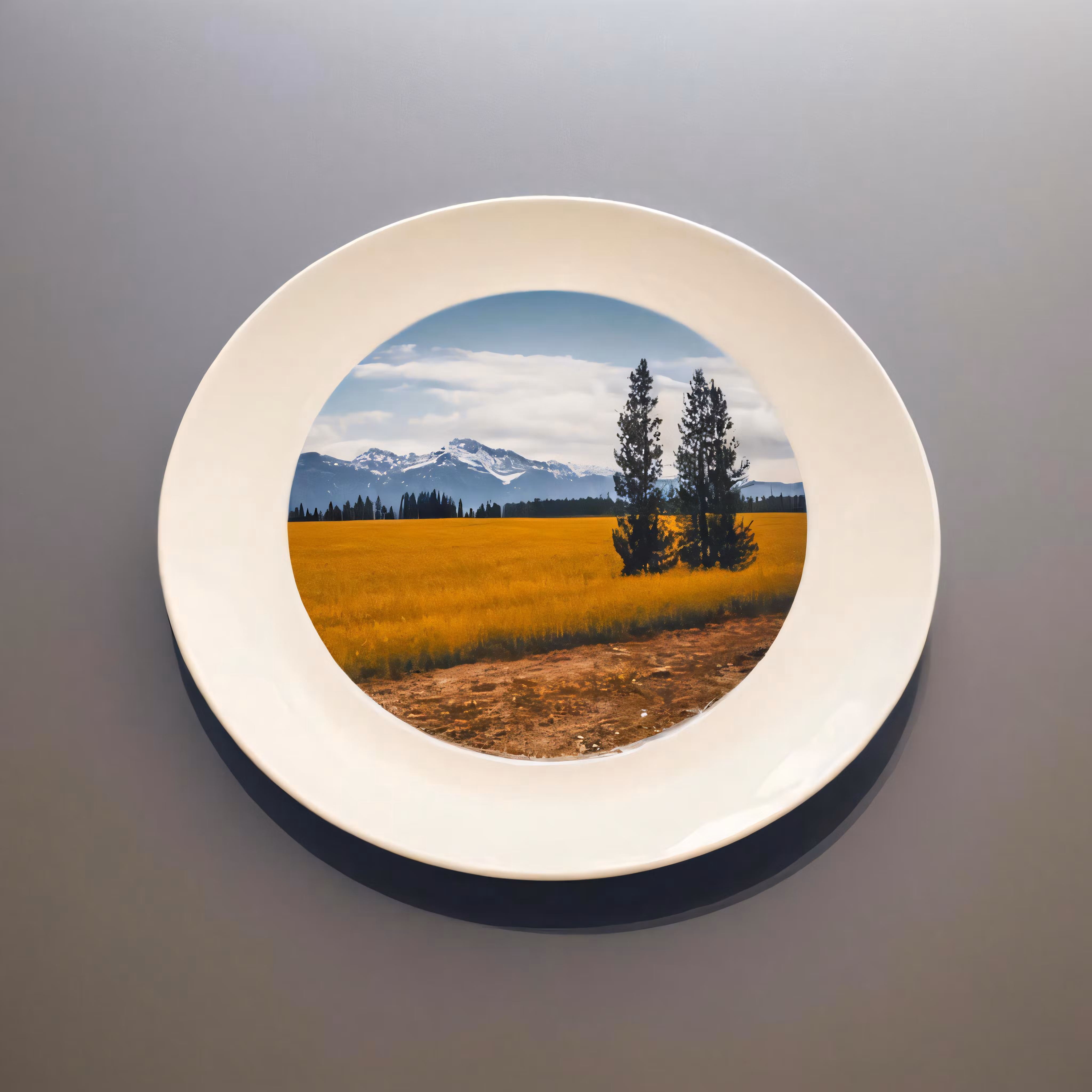 High resolution picture, free to use, an oval plate with a picture of a tree and a field in the middle