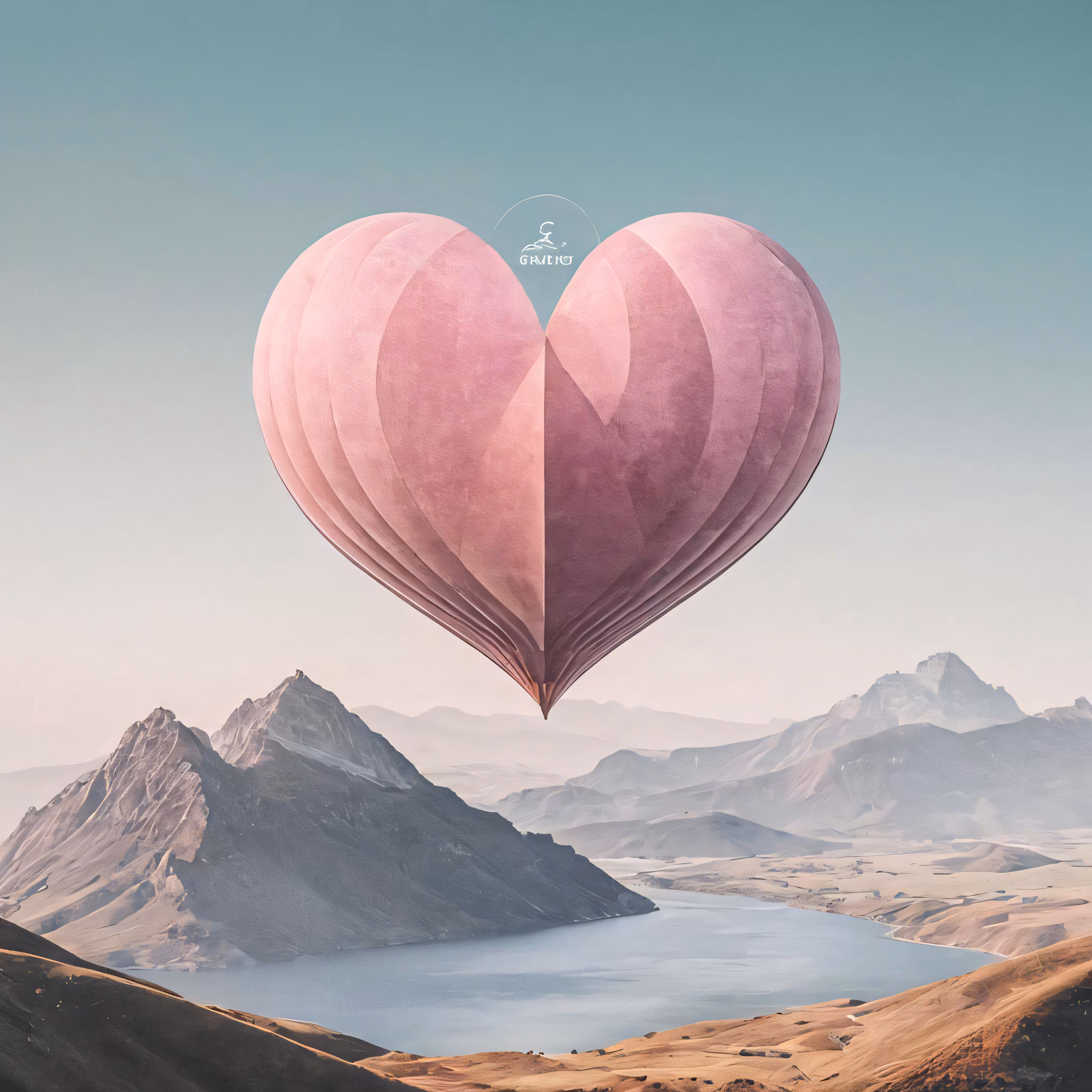 High resolution picture, free to use, an over head view of a heart shaped hot air balloon flying over a lake with mountains