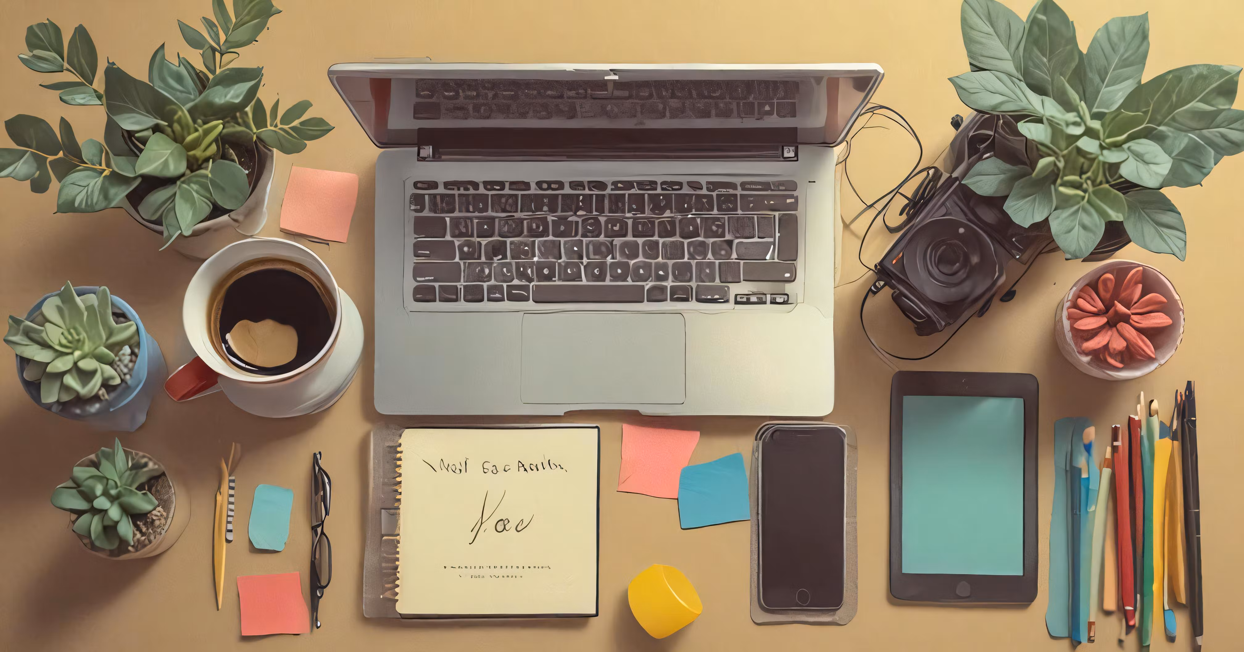 High resolution picture, free to use, an overhead view of a laptop on a desk