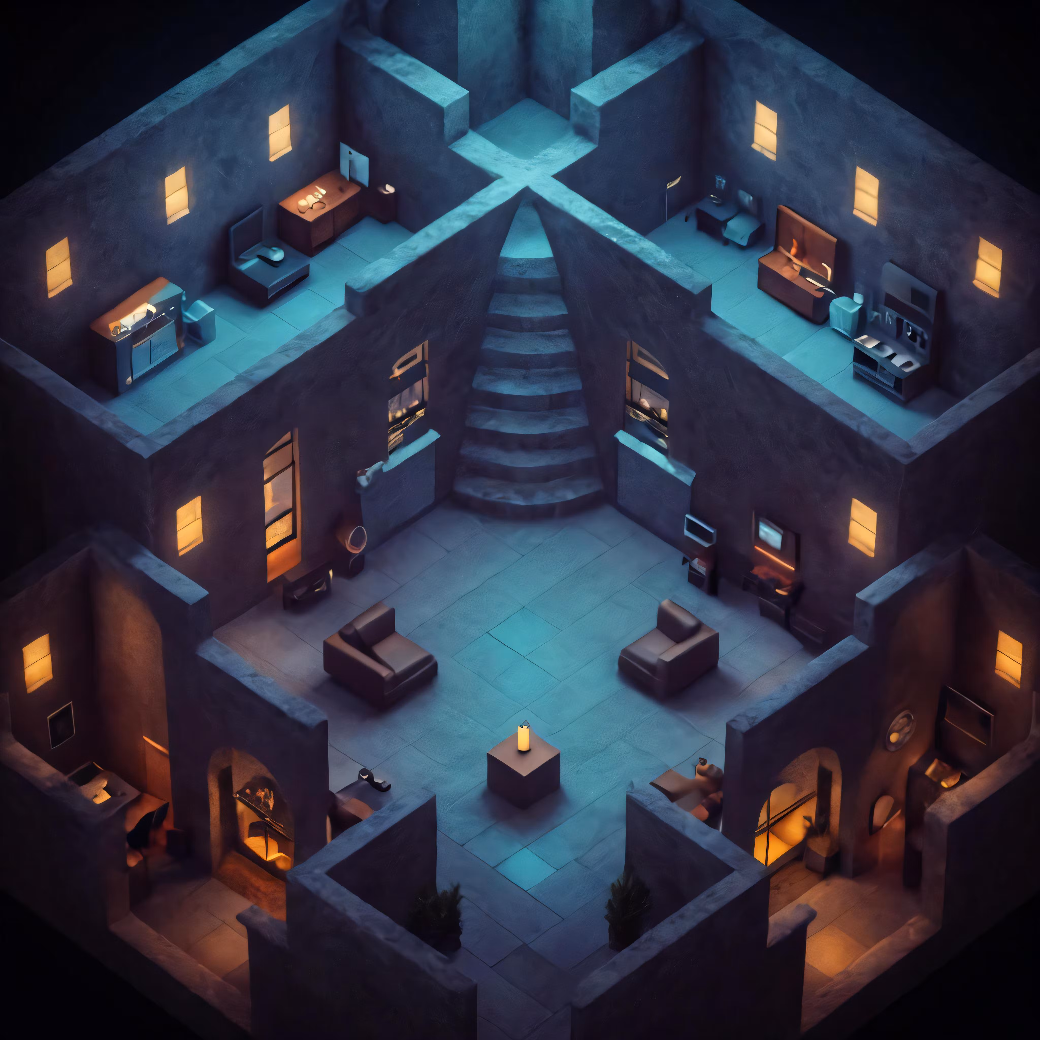 High resolution picture, free to use, an overhead view of a living room, staircase and staircase way