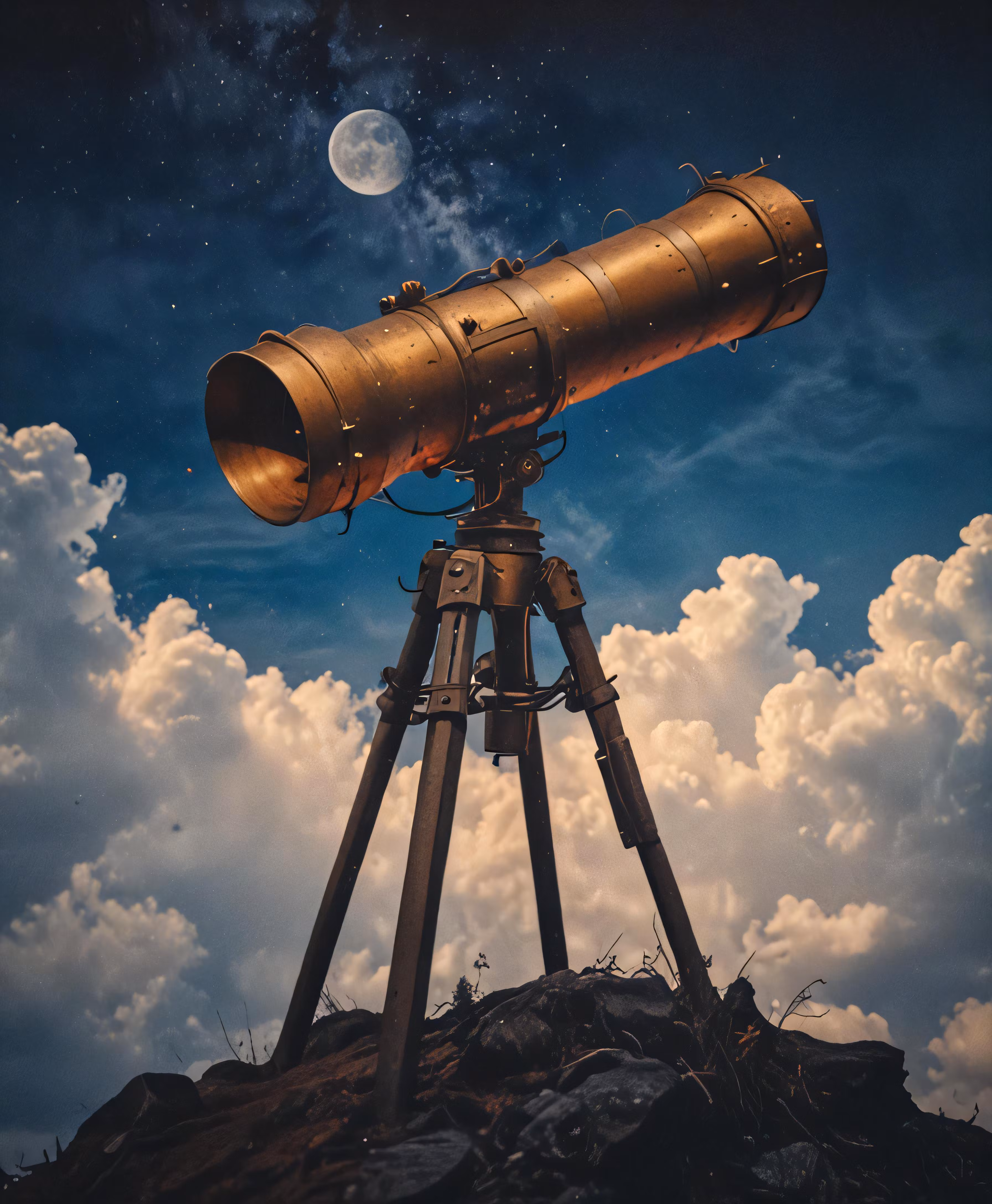 High resolution picture, free to use, an telescope atop a large tripod, on top of a rock, with a full moon behind it